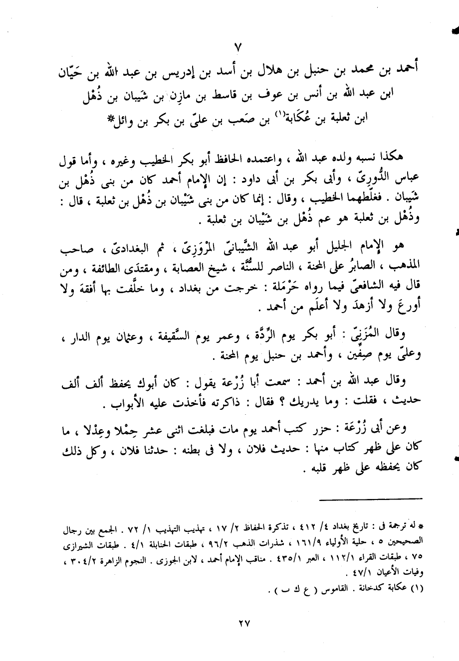 7 - أَحْمَد بْن مُحَمَّد بْن حَنْبَل بْن هِلَال بْن أَسد بْن إِدْرِيس بْن عَبْد اللَّه بن حَيَّان ابْن عَبْد اللَّه بْن أنس بْن عَوْف بْن قاسط بْن مَازِن بْن شَيبَان بْن ذهل ابْن ثَعْلَبَة بْن عكابة بْن صَعب بْن عَلِيّ بن بكر بن وَائِل