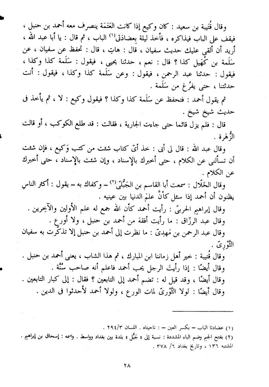 وَقَالَ قُتَيْبَة بْن سَعِيد كَانَ وَكِيع إِذا كَانَت الْعَتَمَة ينْصَرف مَعَه أَحْمَد بْن حَنْبَل فيقف عَلَى الْبَاب فيذاكره فَأخذ لَيْلَة بِعضَادَتَيْ الْبَاب ثمَّ قَالَ يَا أَبَا عَبْد اللَّه أُرِيد أَن ألقِي عَلَيْك حَدِيث سُفْيَان قَالَ هَات قَالَ تحفظ عَن سُفْيَان عَن سَلمَة بْن كهيل كَذَا قَالَ نعم حَدثنَا يَحْيَى فَيَقُول سَلمَة كَذَا وَكَذَا فَيَقُول حَدثنَا عَبْد الرَّحْمَن فَيَقُول وَعَن سَلمَة كَذَا وَكَذَا فَيَقُول أَنْت حَدَّثتنَا حَتَّى يفرغ من سَلمَة