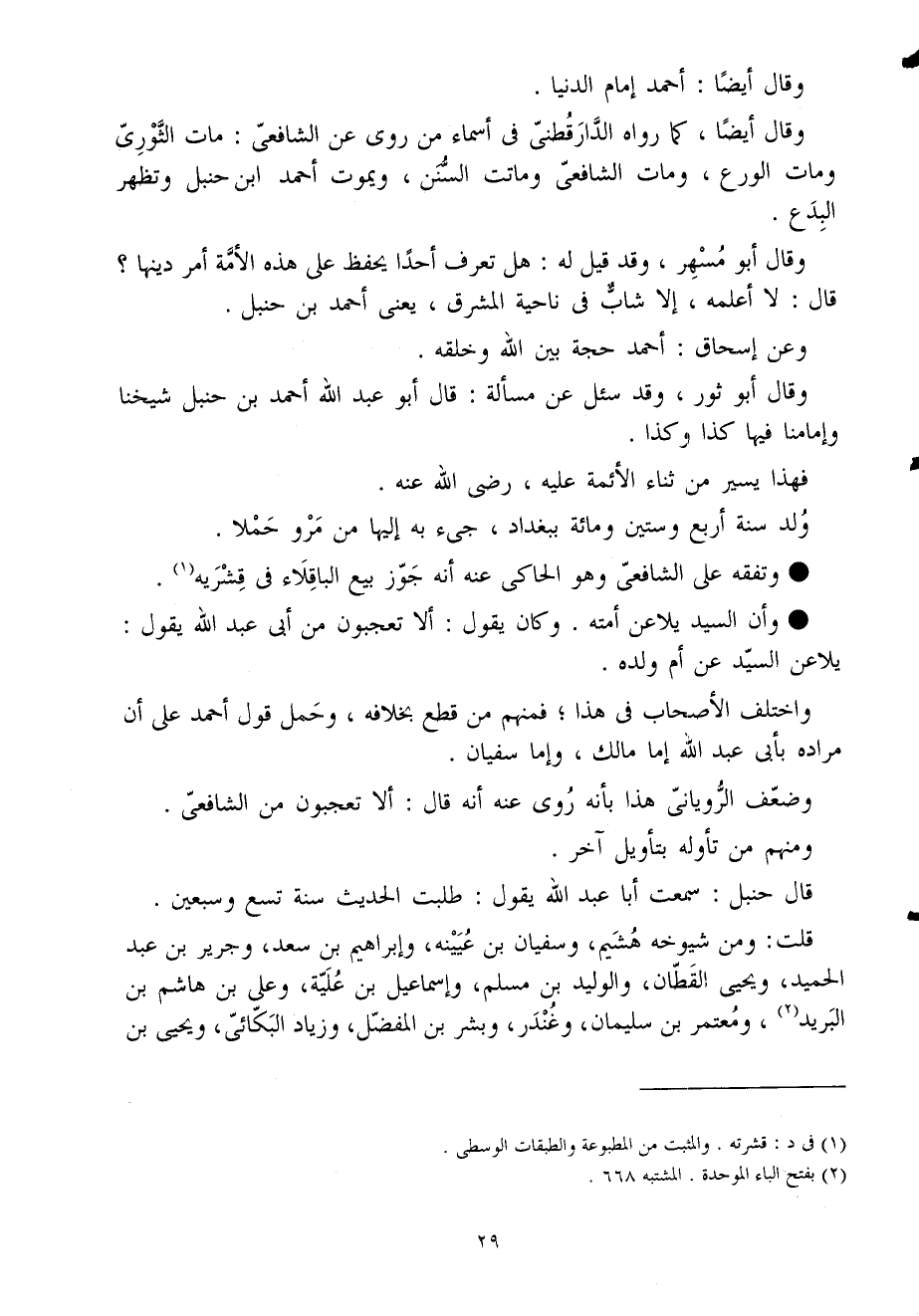 وَقَالَ أَبُو مسْهر وَقد قِيلَ لَهُ هَل تعرف أحدا يحفظ عَلَى هَذِهِ الْأمة أَمر دينهَا قَالَ لَا أعلمهُ إِلَّا شَاب فِي نَاحيَة الْمشرق يَعْنِي أَحْمَد بْن حَنْبَل