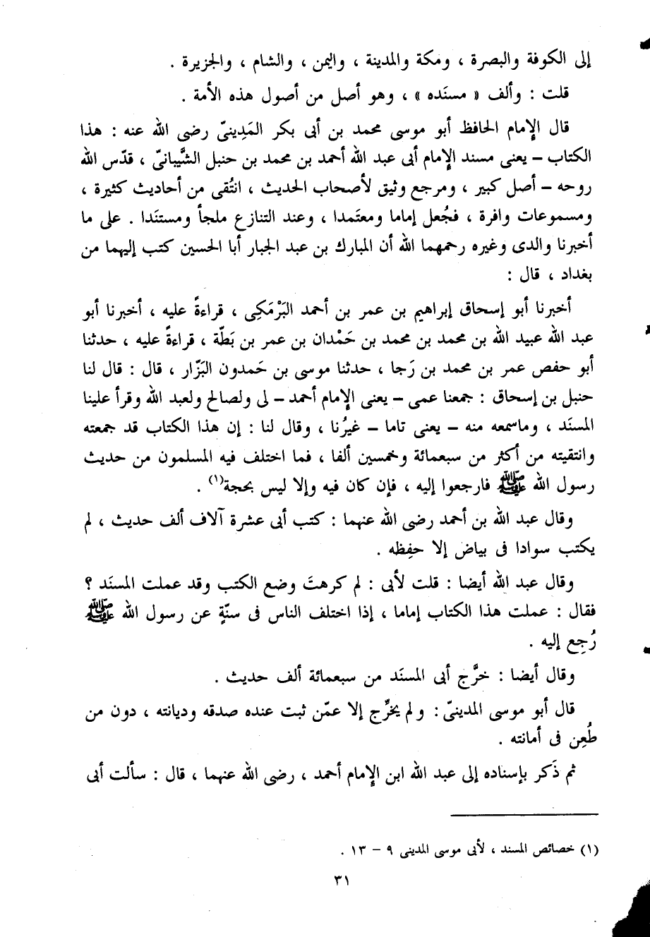 قَالَ الإِمَام الْحَافِظ أَبُو مُوسَى مُحَمَّد بْن أَبِي بكر الْمَدِينِيّ رَضِيَ اللَّهُ عَنْهُ هَذَا الْكتاب يَعْنِي مُسْند الإِمَام أَبِي عَبْد اللَّه أَحْمَد بْن مُحَمَّد بْن حَنْبَل الشَّيْبَانِيّ قدس اللَّه روحه أصل كَبِير ومرجع وثيق لأَصْحَاب الحَدِيث انتقي من أَحَادِيث كَثِيرَة ومسموعات وافرة فَجعل إِمَامًا ومعتمدا وَعند التَّنَازُع ملْجأ ومستندا عَلَى مَا أَخْبَرَنَا وَالِدي وَغَيره رحمهمَا اللَّه أَن الْمُبَارك بْن عَبْد الْجَبَّار أَبَا الْحُسَيْن كتب إِلَيْهِمَا من بَغْدَاد قَالَ