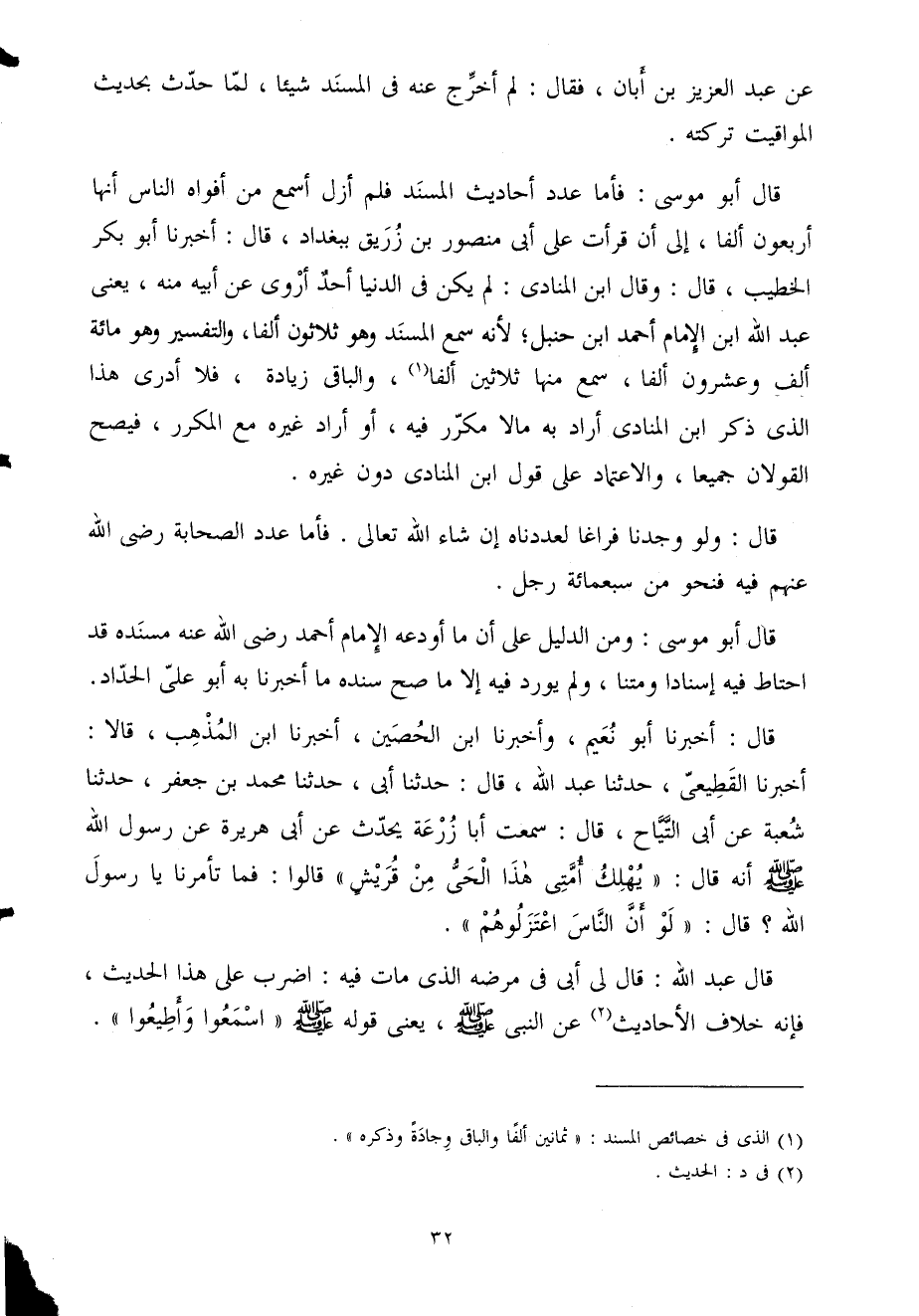قَالَ أَبُو مُوسَى فَأَما عدد أَحَادِيث الْمسند فَلم أزل أسمع من أَفْوَاه النَّاس أَنَّهَا أَرْبَعُونَ ألفا إِلَى أَن قَرَأت عَلَى أَبِي مَنْصُور بْن زُرَيْق بِبَغْدَاد قَالَ أَخْبَرَنَا أَبُو بكر الْخَطِيب قَالَ وَقَالَ ابْن الْمُنَادِي لم يكن فِي الدُّنْيَا أحد أروى عَن أَبِيه مِنْهُ يَعْنِي عَبْد اللَّه ابْن الإِمَام أَحْمد ابْن حَنْبَل لِأَنَّهُ سمع الْمسند وَهُوَ ثَلَاثُونَ ألفا وَالتَّفْسِير وَهُوَ مائَة ألف وَعِشْرُونَ ألفا سمع مِنْهَا ثَلَاثِينَ ألفا وَالْبَاقِي زِيَادَة فَلَا أَدْرِي هَذَا الَّذِي ذكر ابْن الْمُنَادِي أَرَادَ بِهِ مَالا مُكَرر فِيهِ أَو أَرَادَ غَيره مَعَ المكرر فَيصح الْقَوْلَانِ جَمِيعًا والاعتماد عَلَى قَول ابْن الْمُنَادِي دون غَيره