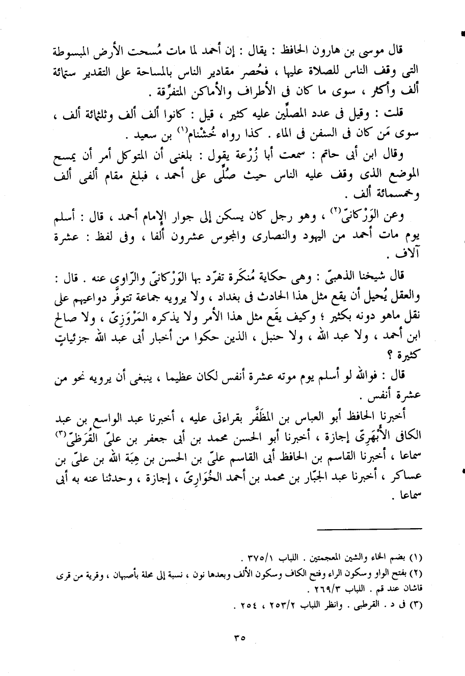 قَالَ مُوسَى بْن هَارُون الْحَافِظ يُقَال إِن أَحْمَد لما مَاتَ مسحت الأَرْض المبسوطة الَّتِي وقف النَّاس للصَّلَاة عَلَيْهَا فحصر مقادير النَّاس بالمساحة على التَّقْدِير سِتّمائَة ألف وَأكْثر سوى مَا كَانَ فِي الْأَطْرَاف والأماكن المتفرقة