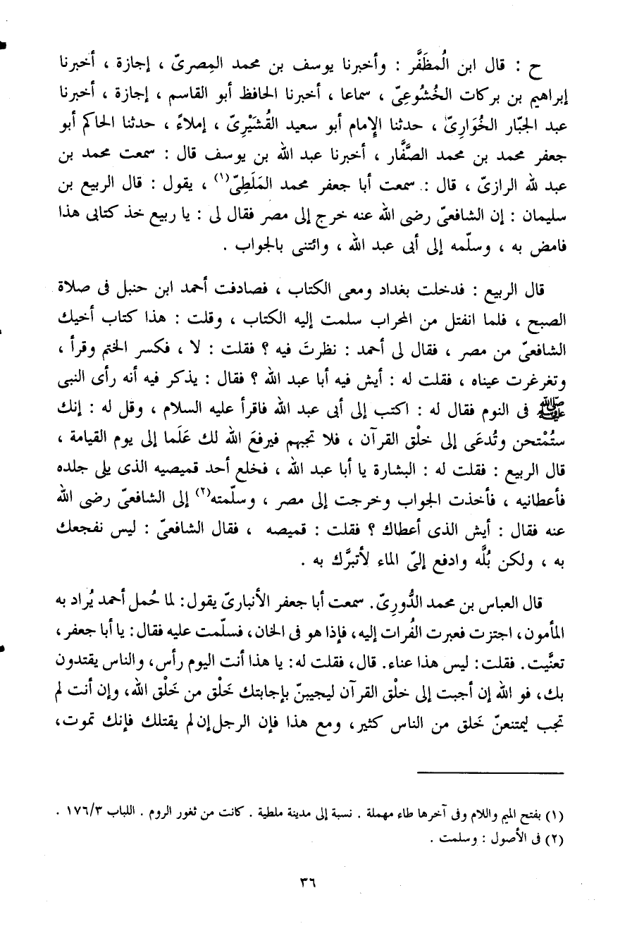 ح قَالَ ابْن المظفر وَأخْبرنَا يُوسُف بن مُحَمَّد الْمصْرِيّ إجَازَة أخبرنَا إِبْرَاهِيم بن بَرَكَات الخشوعي سَمَاعا أَخْبَرَنَا الْحَافِظ أَبُو الْقَاسِم إِجَازَةً أَخْبَرَنَا عَبْد الْجَبَّار الخواري حَدثنَا الإِمَام أَبُو سَعِيد الْقشيرِي إملاء حَدثنَا الْحَاكِم أَبُو جَعْفَر مُحَمَّد بْن مُحَمَّد الصفار أَخْبَرَنَا عَبْد اللَّه بْن يُوسُف قَالَ سَمِعت مُحَمَّد بْن عَبْد لله الرَّازِيّ قَالَ سَمِعت أَبَا جَعْفَر مُحَمَّد الْمَلْطِي يَقُول قَالَ الرّبيع بْن سُلَيْمَان إِن الشَّافِعِي رَضِيَ اللَّهُ عَنْهُ خرج إِلَى مصر فَقَالَ لي يَا ربيع خُذ كتابي هَذَا فَامْضِ بِهِ وَسلمهُ إِلَى أَبِي عَبْد اللَّه وائتني بِالْجَوَابِ