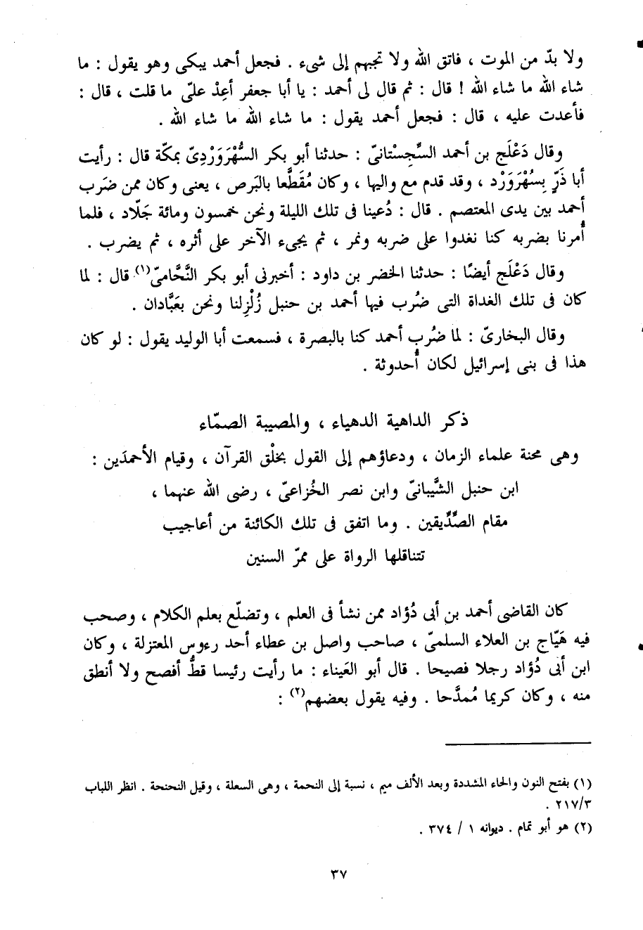 ذكر الداهية الدهياء والمصيبة الصماء وَهِي محنة عُلَمَاء الزَّمَان ودعاؤهم إِلَى القَوْل بِخلق الْقُرْآن وَقيام الأَحْمَدين ابْن حَنْبَل الشَّيْبَانِيّ وَابْن نصر الْخُزَاعِيّ رَضِيَ اللَّهُ عَنْهُما مقَام الصديقين وَمَا اتّفق فِي تِلْكَ الكائنة من أَعَاجِيب تتناقلها الروَاة عَلَى ممر السنين