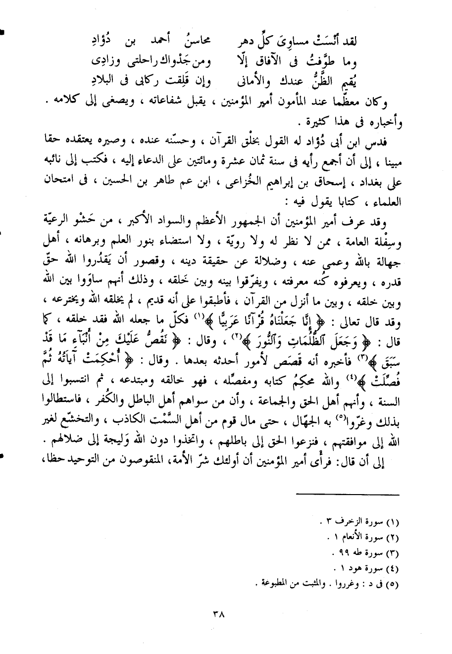 وَقد عرف أَمِير الْمُؤمنِينَ أَن الْجُمْهُور الْأَعْظَم والسواد الْأَكْبَر من حَشْو الرّعية وسفلة الْعَامَّة مِمَّن لَا نظر لَهُ وَلَا روية وَلَا استضاء بِنور الْعلم وبرهانه أهل جَهَالَة بِاللَّه وعمى عَنهُ وضلالة عَن حَقِيقَة دينه وقصور أَن يقدروا اللَّه حق قدره ويعرفوه كنه مَعْرفَته ويفرقوا بَينه وَبَين خلقه وَذَلِكَ أَنهم ساووا بَين اللَّه وَبَين خلقه وَبَين مَا أنزل من الْقُرْآن فأطبقوا عَلَى أَنه قديم لم يخلقه اللَّه ويخترعه وَقد قَالَ تَعَالَى {إِنَّا جَعَلْنَاهُ قُرْآنًا عَرَبِيًّا} فَكل مَا جعله اللَّه فقد خلقه كَمَا قَالَ {وَجعل الظُّلُمَات والنور} وَقَالَ {نَقُصُّ عَلَيْكَ مِنْ أَنْبَاءِ مَا قَدْ سبق} فَأخْبرهُ أَنه قصَص لأمور أحدثه بعْدهَا وَقَالَ {أحكمت آيَاته ثمَّ فصلت} وَالله مُحكم كِتَابه ومفصله فَهُوَ خالقه ومبتدعه ثمَّ انتسبوا إِلَى السّنة وَأَنَّهُمْ أهل الْحق وَالْجَمَاعَة وَأَن من سواهُم أهل الْبَاطِل وَالْكفْر فاستطالوا بذلك وغروا بِهِ الْجُهَّال حَتَّى مَال قوم من أهل السمت الْكَاذِب والتخشع لغير اللَّه إِلَى موافقتهم فنزعوا الْحق إِلَى باطلهم وَاتَّخذُوا دون اللَّه وليجة إِلَى ضلالهم