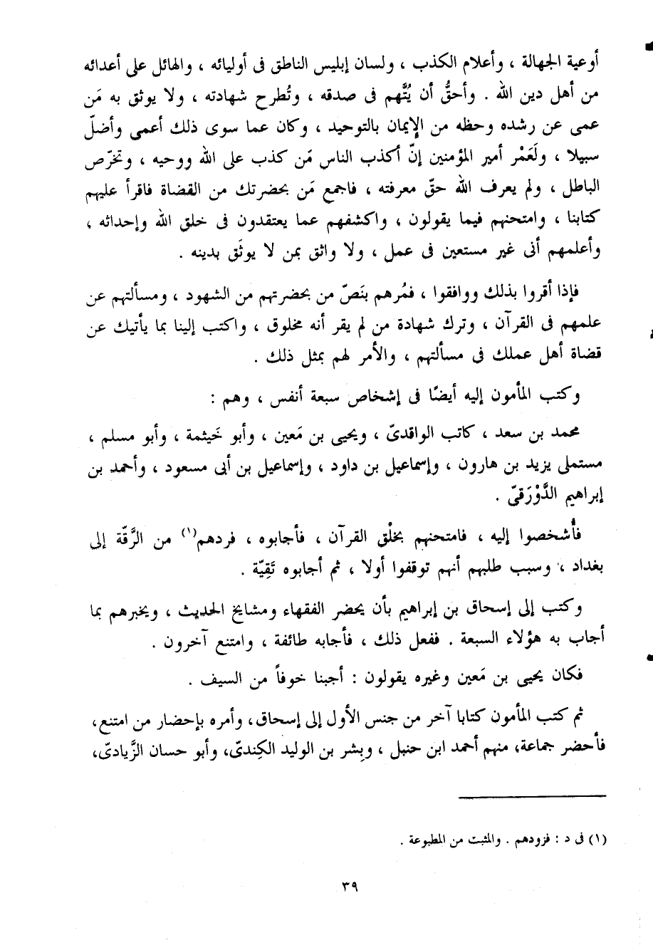 أوعية الْجَهَالَة وأعلام الْكَذِب ولسان إِبْلِيس النَّاطِق فِي أوليائه والهائل عَلَى أعدائه من أهل دين اللَّه وأحق أَن يتهم فِي صدقه وتطرح شَهَادَته وَلَا يوثق بِهِ من عمي عَن رشده وحظه من الْإِيمَان بِالتَّوْحِيدِ وَكَانَ عَمَّا سوى ذَلِك أعمى وأضل سَبِيلا ولعمر أَمِير الْمُؤمنِينَ إِن أكذب النَّاس من كذب عَلَى اللَّه ووحيه وتخرص الْبَاطِل وَلم يعرف اللَّه حق مَعْرفَته فاجمع من بحضرتك من الْقُضَاة فاقرأ عَلَيْهِم كتَابنَا وامتحنهم فِيمَا يَقُولُونَ واكشفهم عَمَّا يَعْتَقِدُونَ فِي خلق اللَّه وإحداثه وأعلمهم أَنِّي غير مستعين فِي عمل وَلَا واثق بِمن لَا يوثق بِدِينِهِ