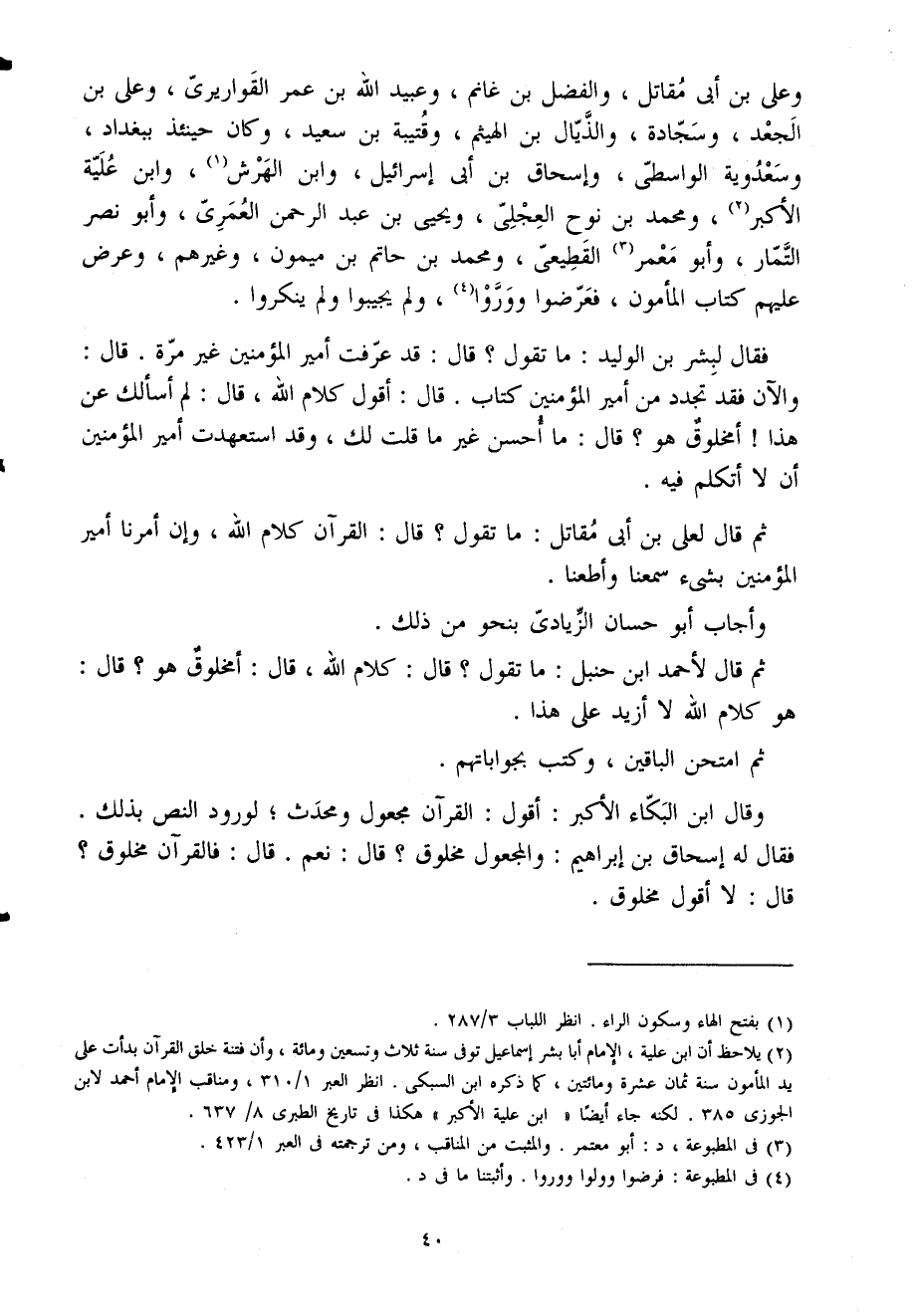 وَقَالَ ابْن الْبكاء الْأَكْبَر أَقُول الْقُرْآن مجعول ومحدث لوُرُود النَّص بذلك فَقَالَ لَهُ إِسْحَاق بْن إِبْرَاهِيم والمجعول مَخْلُوق قَالَ نعم قَالَ فالقرآن مَخْلُوق قَالَ لَا أَقُول مَخْلُوق