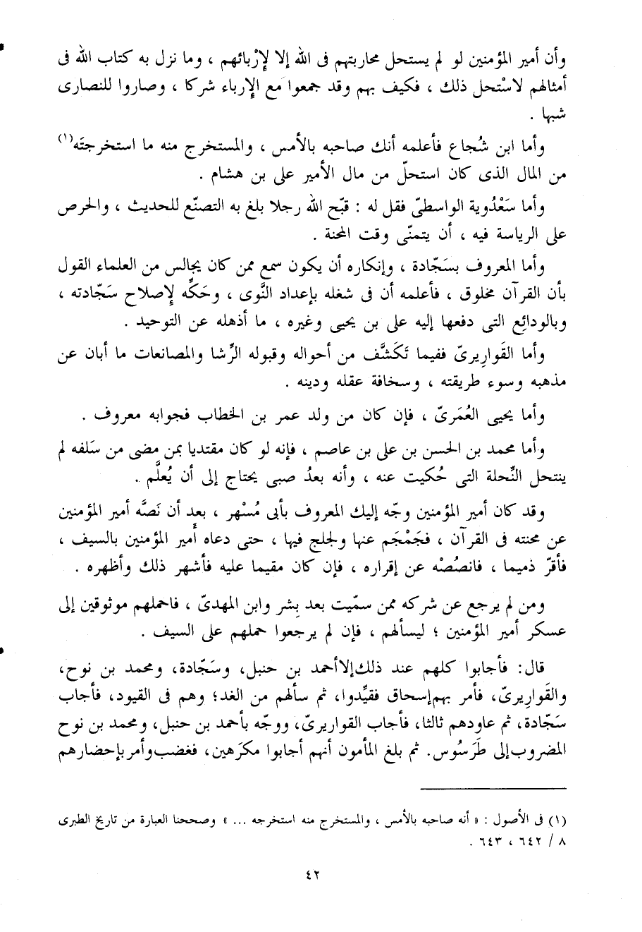 وَقد كَانَ أَمِير الْمُؤمنِينَ وَجه إِلَيْك الْمَعْرُوف بِأبي مسْهر بعد أَن نَصه أَمِير الْمُؤمنِينَ عَن محنته فِي الْقُرْآن فجمجم عَنْهَا ولجلج فِيهَا حَتَّى دَعَاهُ أَمِير الْمُؤمنِينَ بِالسَّيْفِ فَأقر ذَمِيمًا فانصصه عَن إِقْرَاره فَإِن كَانَ مُقيما عَلَيْهِ فأشهر ذَلِك وأظهره