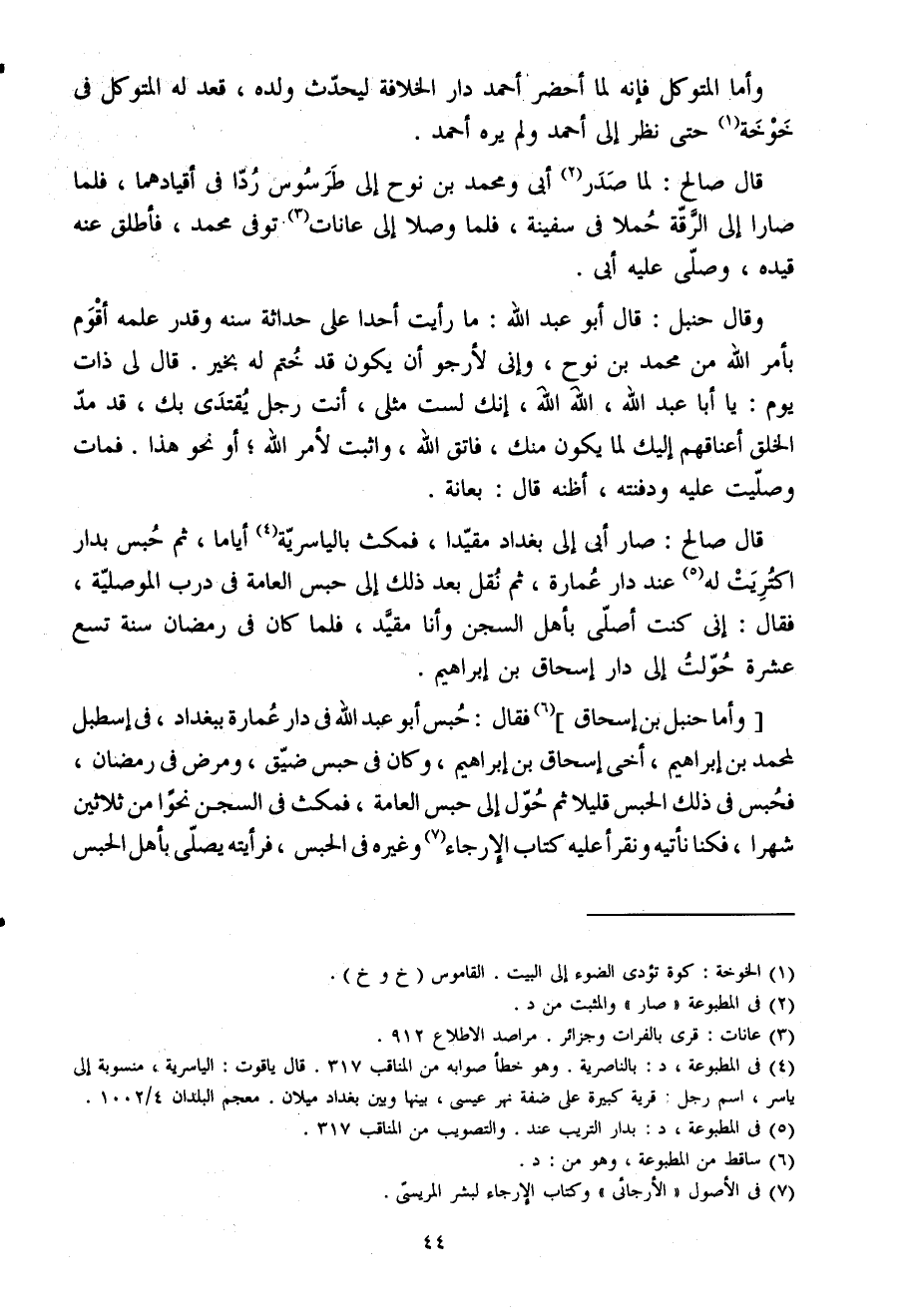 وَأما حَنْبَل بْن إِسْحَاق فَقَالَ حبس أَبُو عَبْد اللَّه فِي دَار عمَارَة بِبَغْدَاد فِي إسطبل لمُحَمَّد بْن إِبْرَاهِيم أخي إِسْحَاق بْن إِبْرَاهِيم وَكَانَ فِي حبس ضيق وَمرض فِي رَمَضَان فحبس فِي ذَلِك الْحَبْس قَلِيلا ثمَّ حول إِلَى حبس الْعَامَّة فَمَكثَ فِي السجْن نَحوا من ثَلَاثِينَ شهرا فَكُنَّا نأتيه ونقرأ عَلَيْهِ كتاب الإرجاء وَغَيره فِي الْحَبْس فرأيته يُصَلِّي بِأَهْل الْحَبْس