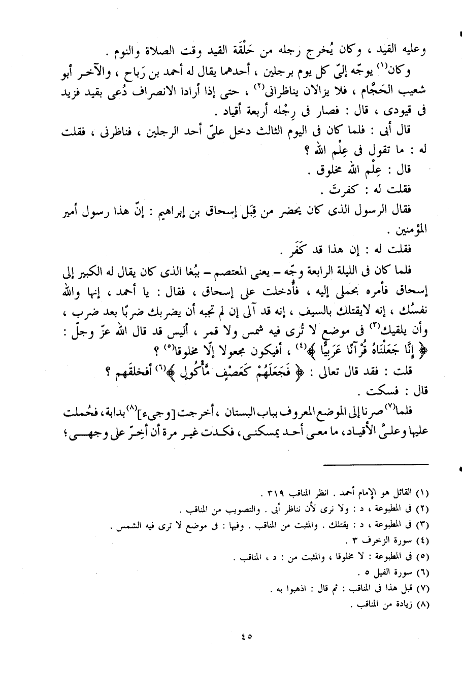 فَلَمَّا كَانَ فِي اللَّيْلَة الرَّابِعَة وَجه يَعْنِي المعتصم ببغا الَّذِي كَانَ يُقَال لَهُ الْكَبِير إِلَى إِسْحَاق فَأمره بحملي إِلَيْهِ فأدخلت عَلَى إِسْحَاق فَقَالَ يَا أَحْمَد إِنَّهَا وَالله نَفسك إِنَّه لَا يقتلك بِالسَّيْفِ إِنَّه قد آلى إِن لم تجبه أَن يَضْرِبك ضربا بعد ضرب وَأَن يلقيك فِي مَوضِع لَا ترى فِيهِ شمس وَلَا قمر أَلَيْسَ قد قَالَ الله عز وَجل {إِنَّا جَعَلْنَاهُ قُرْآنًا عَرَبيا} أفيكون مجعولا إِلَّا مخلوقا قلت فقد قَالَ تَعَالَى {فجعلهم كعصف مَأْكُول} أفخلقهم قَالَ فَسكت