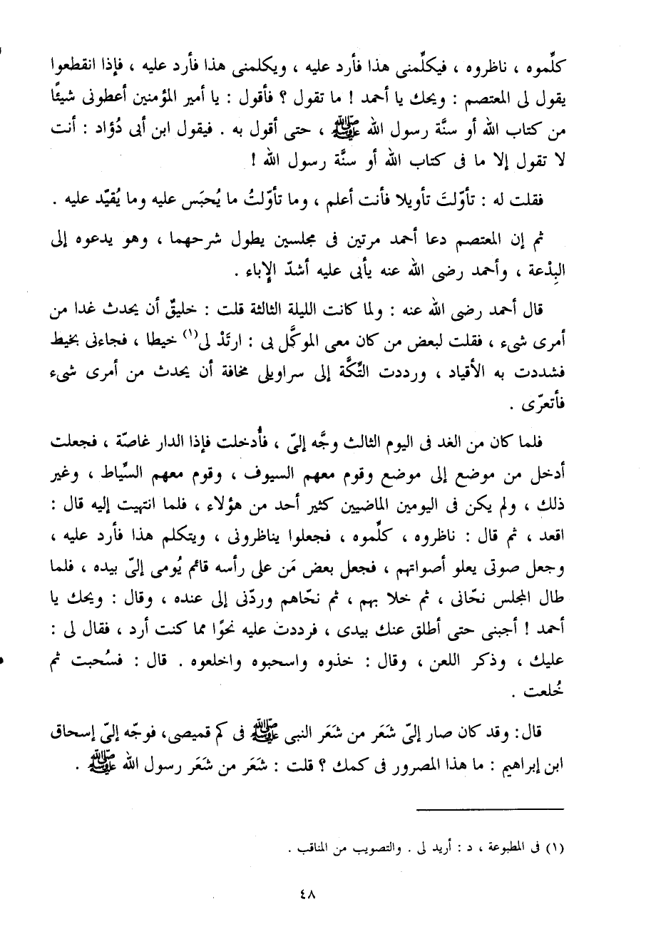 كَلمُوهُ ناظروه فيكلمني هَذَا فأرد عَلَيْهِ ويكلمني هَذَا فأرد عَلَيْهِ فَإِذا انْقَطَعُوا يَقُول لي المعتصم وَيحك يَا أَحْمَد مَا تَقول فَأَقُول يَا أَمِير الْمُؤمنِينَ أعطوني شَيْئا من كتاب اللَّه أَو سنة رَسُول اللَّهِ صَلَّى اللَّهُ عَلَيْهِ وَسَلَّمَ حَتَّى أَقُول بِهِ فَيَقُول ابْن أَبِي دؤاد أَنْت لَا تَقول إِلَّا مَا فِي كتاب اللَّه أَو سنة رَسُول اللَّهِ فَقلت لَهُ تأولت تَأْوِيلا فَأَنت أعلم وَمَا تأولت مَا يحبس عَلَيْهِ وَمَا يُقيد عَلَيْهِ