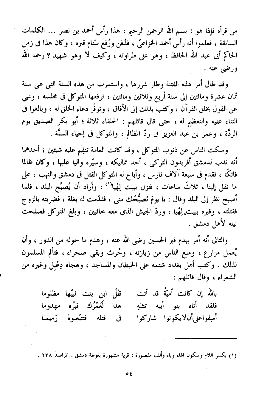 من قَرَأَهُ فَإِذا هُوَ بِسْمِ اللَّهِ الرَّحْمَنِ الرَّحِيمِ هَذَا رَأس أَحْمَد بْن نصر الْكَلِمَات السَّابِقَة فَعَلمُوا أَنه رَأس أَحْمَد الْخُزَاعِيّ فَدفن وَرفع سَنَام قَبره وَكَانَ هَذَا فِي زمن الْحَاكِم أَبِي عَبْد اللَّه الْحَافِظ وَهُوَ عَلَى طراوته وَكَيف لَا وَهُوَ شَهِيد رَحمَه اللَّه وَرَضي عَنهُ