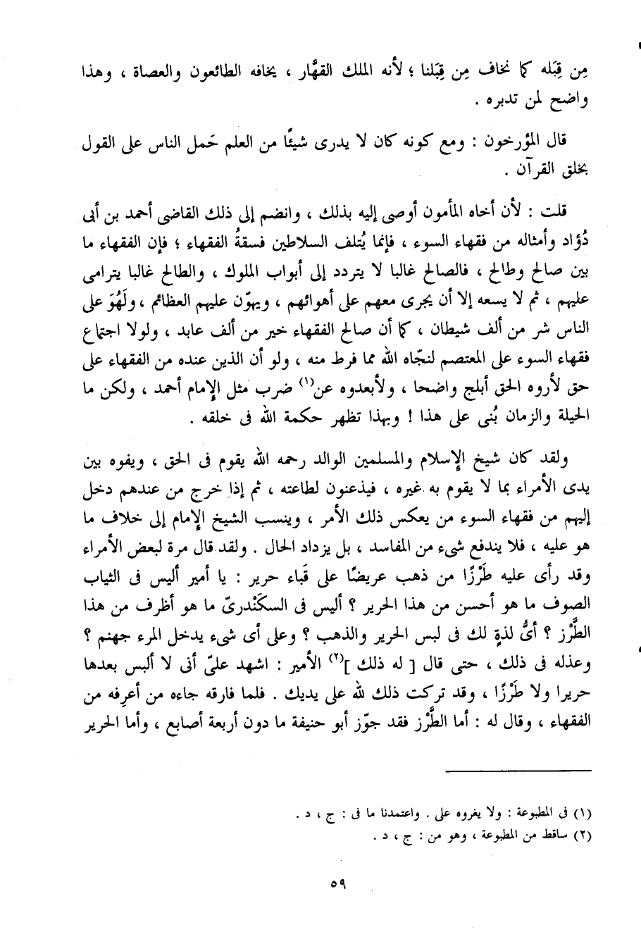 قلت لِأَن أَخَاهُ الْمَأْمُون أوصى إِلَيْهِ بذلك وانضم إِلَى ذَلِك القَاضِي أَحْمَد بْن أَبِي دؤاد وَأَمْثَاله من فُقَهَاء السوء فَإِنَّمَا يتْلف السلاطين فسقة الْفُقَهَاء فَإِن الْفُقَهَاء مَا بَين صَالح وطالح فالصالح غَالِبا لَا يتَرَدَّد إِلَى أَبْوَاب الْمُلُوك والطالح غَالِبا يترامى عَلَيْهِم ثمَّ لَا يَسعهُ إِلَّا أَن يجْرِي مَعَهم عَلَى أهوائهم ويهون عَلَيْهِم العظائم وَلَهو عَلَى النَّاس شَرّ من ألف شَيْطَان كَمَا أَن صَالح الْفُقَهَاء خير من ألف عَابِد وَلَوْلَا اجْتِمَاع فُقَهَاء السوء عَلَى المعتصم لنجاه اللَّه مِمَّا فرط مِنْهُ وَلَو أَن الَّذين عِنْده من الْفُقَهَاء عَلَى حق لأروه الْحق أَبْلَج وَاضحا ولأبعدوه عَن ضرب مثل الإِمَام أَحْمَد وَلَكِن مَا الْحِيلَة وَالزَّمَان بني عَلَى هَذَا وَبِهَذَا تظهر حِكْمَة اللَّه فِي خلقه