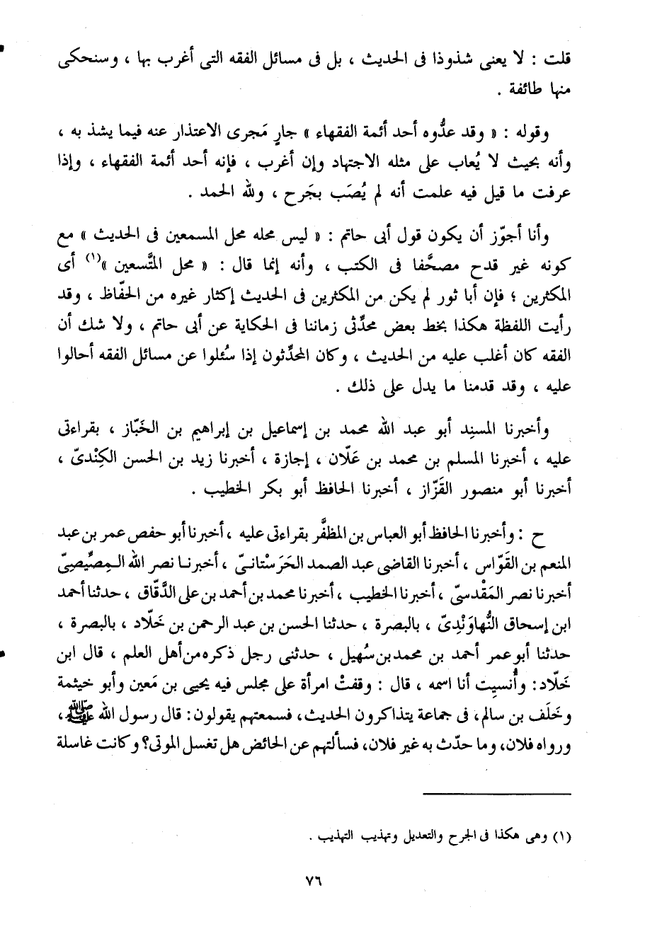 ح وَأَخْبَرَنَا الْحَافِظُ أَبُو الْعَبَّاسِ بْنُ الْمُظَفَّرِ بِقِرَاءَتِي عَلَيْهِ أَخْبَرَنَا أَبُو حَفْصٍ عمر بن عبد الْمُنعم بن القواس أخبرنَا الْقَاضِي عَبْدُ الصَّمَدِ الْحَرَسْتَانِيُّ أَخْبَرَنَا نَصْرُ اللَّهِ الْمِصِّيصِيُّ أَخْبَرَنَا نَصْرٌ الْمَقْدِسِيُّ أَخْبَرَنَا الْخَطِيبُ أَخْبَرَنَا مُحَمَّدُ بْنُ أَحْمَدَ بْنِ عَلِيٍّ الدَّقَّاقُ حَدثنَا أَحْمد ابْن إِسْحَاقَ النُّهَاوَنْدِيُّ بِالْبَصْرَةِ حَدثنَا الْحَسَنُ بْنُ عَبْدِ الرَّحْمَنِ بْنِ خَلادٍ بِالْبَصْرَةِ حَدثنَا أَبُو عُمَرَ أَحْمَدُ بْنُ مُحَمَّدِ بْنِ سُهَيْلٍ حَدَّثَنِي رَجُلٌ ذَكَرَهُ مِنْ أَهْلِ الْعِلْمِ قَالَ ابْنُ خَلادٍ وَأُنْسِيتُ أَنَا اسْمَهُ قَالَ وَقَفَتِ امْرَأَةٌ عَلَى مَجْلِسٍ فِيهِ يَحْيَى بْنُ مَعِينٍ وَأَبُو خَيْثَمَةَ وَخَلَفُ بْنُ سَالِمٍ فِي جَمَاعَةٍ يَتَذَاكَرُونَ الْحَدِيثَ فَسَمِعَتْهُمْ يَقُولُونَ قَالَ رَسُولُ اللَّهِ صَلَّى اللَّهُ عَلَيْهِ وَسَلَّمَ وَرَوَاهُ فُلانٌ وَمَا حَدَّثَ بِهِ غَيْرُ فُلانٍ فَسَأَلَتْهُمْ عَنِ الْحَائِضِ هَلْ تَغْسِلُ الْمَوْتَى وَكَانَتْ غَاسِلَةً