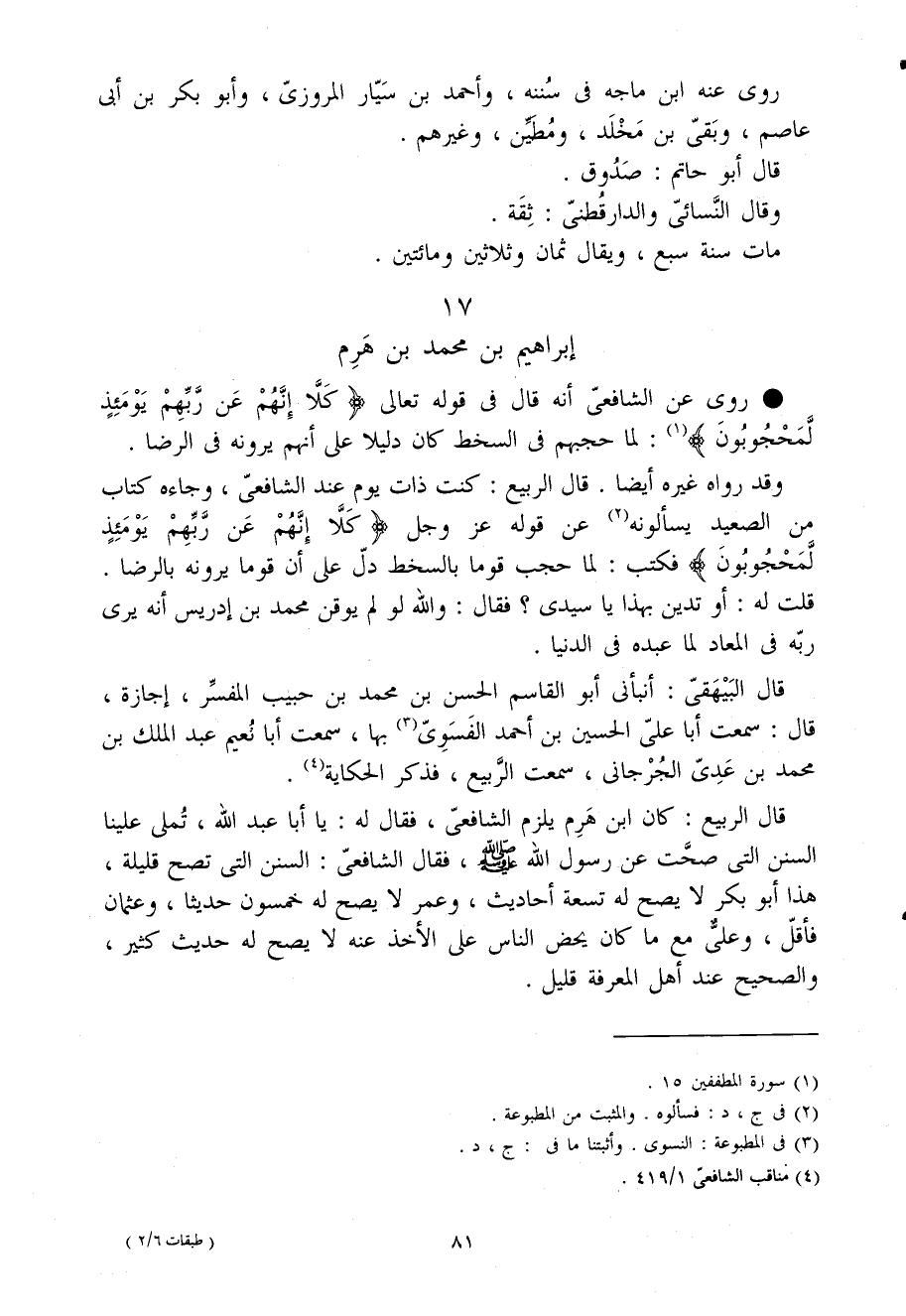 وَقد رَوَاهُ غَيره أَيْضًا قَالَ الرّبيع كنت ذَات يَوْم عِنْد الشَّافِعِي وجاءه كتاب من الصَّعِيد يسألونه عَن قَوْله عز وَجل {كَلَّا إِنَّهُمْ عَنْ رَبِّهِمْ يَوْمئِذٍ لمحجوبون} فَكتب لما حجب قوما بالسخط دلّ عَلَى أَن قوما يرونه بِالرِّضَا