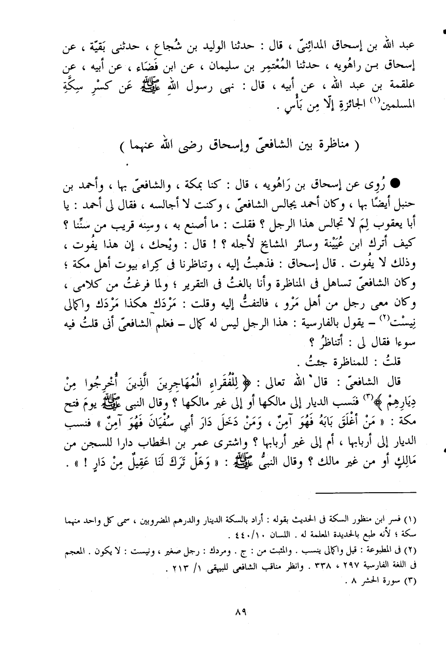 مناظرة بَين الشَّافِعِي وَإِسْحَاق رَضِيَ اللَّهُ عَنْهُما
