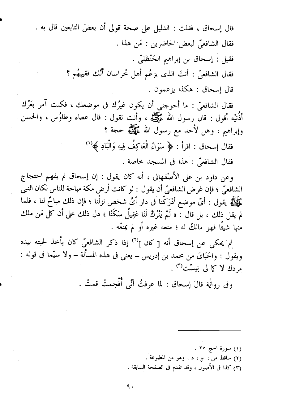 وَعَن دَاوُد بْن عَلِيّ الْأَصْفَهَانِي أَنه كَانَ يَقُول إِن إِسْحَاق لم يفهم احتجاج الشَّافِعِي فَإِن غَرَض الشَّافِعِي أَن يَقُول لَو كَانَت أَرض مَكَّة مُبَاحَة للنَّاس لَكَانَ النَّبِي صَلَّى اللَّهُ عَلَيْهِ وَسَلَّمَ يَقُول أَي مَوضِع أدركنا فِي دَار أَي شخص نزلنَا فَإِن ذَلِك مُبَاح لنا فَلَمَّا لم يقل ذَلِك بل قَالَ (لم يتْرك لنا عقيل سكنا) دلّ ذَلِك عَلَى أَن كل من ملك مِنْهَا شَيْئا فَهُوَ مَالك لَهُ مَنعه غَيره أَو لم يمنعهُ