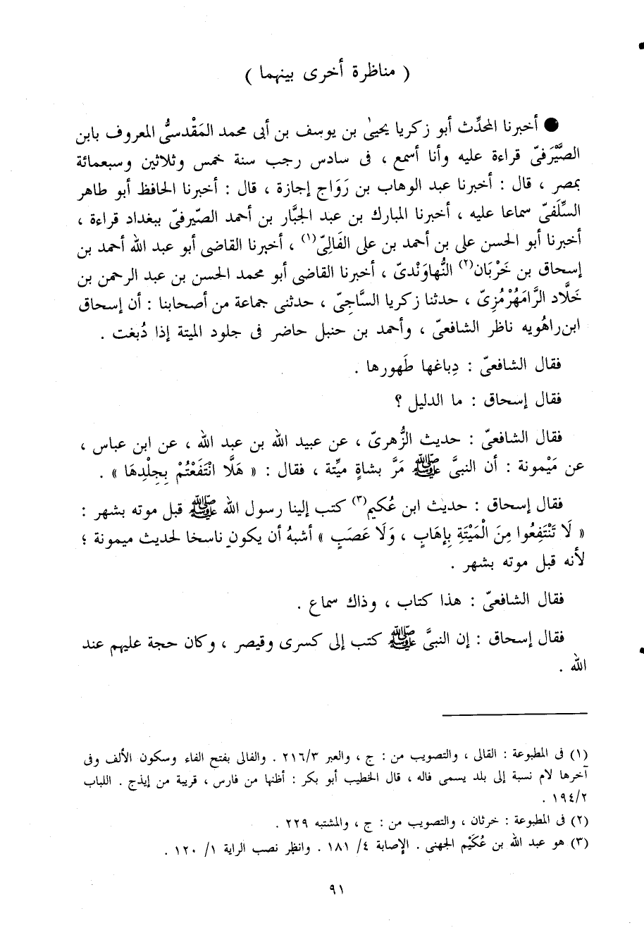 أَخْبَرَنَا الْمُحدث أَبُو زَكَرِيَّا يَحْيَى بْن يُوسُف بْن أَبِي مُحَمَّد الْمَقْدِسِي الْمَعْرُوف بِابْن الصَّيْرَفِي قِرَاءَةً عَلَيْهِ وَأَنَا أَسْمَعُ فى سادس رَجَب سنة خمس وَثَلَاثِينَ وَسَبْعمائة بِمصْر قَالَ أَخْبَرَنَا عَبْد الْوَهَّاب بْن رواج إجَازَة قَالَ أخبرنَا الْحَافِظ أَبُو طَاهِر السلَفِي سَمَاعا عَلَيْهِ أَخْبَرَنَا الْمُبَارك بْن عَبْد الْجَبَّار بْن أَحْمَد الصَّيْرَفِي بِبَغْدَاد قِرَاءَة أَخْبَرَنَا أَبُو الْحَسَن عَلِيّ بْن أَحْمَد بْن عَلِيّ الفالي أَخْبَرَنَا القَاضِي أَبُو عَبْد اللَّه أَحْمَد بْن إِسْحَاق بْن خربَان النهاوندي أَخْبَرَنَا القَاضِي أَبُو مُحَمَّد الْحَسَن بْن عَبْد الرَّحْمَن بْن خَلاد الرامَهُرْمُزِي حَدثنَا زَكَرِيَّا السَّاجِي حَدَّثَنِي جمَاعَة من أَصْحَابنَا أَن إِسْحَاق ابْن رَاهَوَيْه نَاظر الشَّافِعِي وأَحْمَد بْن حَنْبَل حَاضر فِي جُلُود الْميتَة إِذا دبغت