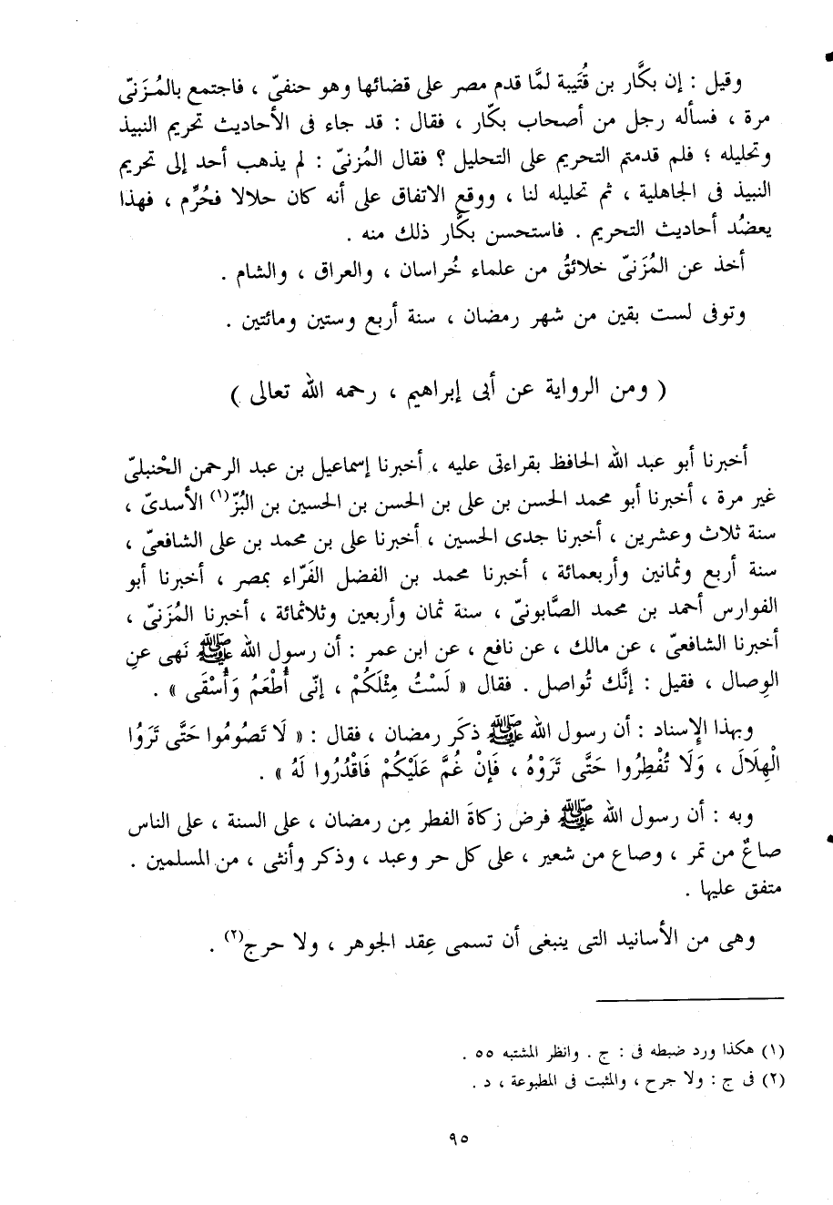 أَخْبَرَنَا أَبُو عبد الله الْحَافِظ بِقِرَاءَتِي عَلَيْهِ أخبرنَا إِسْمَاعِيلُ بْنُ عَبْدِ الرَّحْمَنِ الْحَنْبَلِيُّ غَيْرَ مَرَّةٍ أَخْبَرَنَا أَبُو مُحَمَّدٍ الْحَسَنُ بْنُ عَلِيِّ بْنِ الْحسن بن الْحُسَيْن بن الْبَز الأسدى سَنَةَ ثَلاثٍ وَعِشْرِينَ أَخْبَرَنَا جَدِّي الْحُسَيْنُ أَخْبَرَنَا عَلِيُّ بْنُ مُحَمَّدِ بْنِ عَلِيٍّ الشَّافِعِيُّ سَنَةَ أَربع وَثَمَانِينَ وَأَرْبَعمِائَة أَخْبَرَنَا مُحَمَّدُ بْنُ الْفَضْلِ الْفَرَّاءُ بِمِصْرَ أَخْبَرَنَا أَبُو الْفَوَارِسِ أَحْمَدُ بْنُ مُحَمَّدٍ الصَّابُونِيُّ سَنَةَ ثَمَان وَأَرْبَعين وثلاثمائة أَخْبَرَنَا الْمُزَنِيُّ أَخْبَرَنَا الشَّافِعِيُّ عَنْ مَالِكٍ عَنْ نَافِعٍ عَنِ ابْنِ عُمَرَ أَنَّ رَسُولَ اللَّهِ صَلَّى اللَّهُ عَلَيْهِ وَسَلَّمَ نَهَى عَنِ الْوِصَالِ فَقِيلَ إِنَّكَ تُوَاصِلُ فَقَالَ لَسْتُ مِثْلَكُمْ إِنِّي أُطْعَمُ وَأُسْقَى