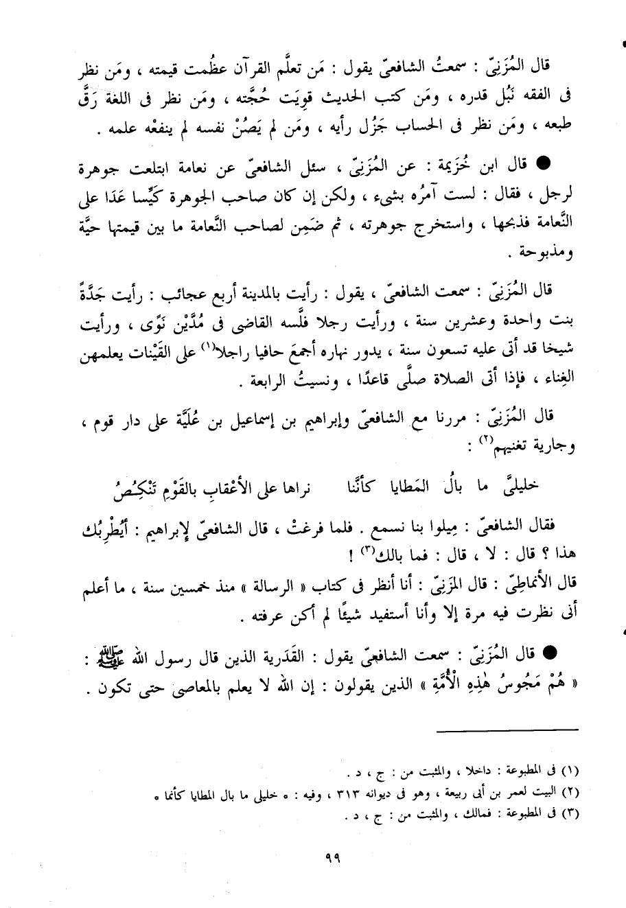 قَالَ المزنى سَمِعت الشافعى يَقُول رَأَيْت بِالْمَدِينَةِ أَربع عجائب رَأَيْت جدة بنت وَاحِدَة وَعشْرين سنة وَرَأَيْت رجلا فلسه القاضى فى مَدين نوى وَرَأَيْت شَيخا قد أَتَى عَلَيْهِ تسعون سنة يَدُور نَهَاره أجمع حافيا رَاجِلا على الْقَيْنَات يعلمهُنَّ الْغناء فَإِذا أَتَى الصَّلَاة صلى قَاعِدا ونسيت الرَّابِعَة