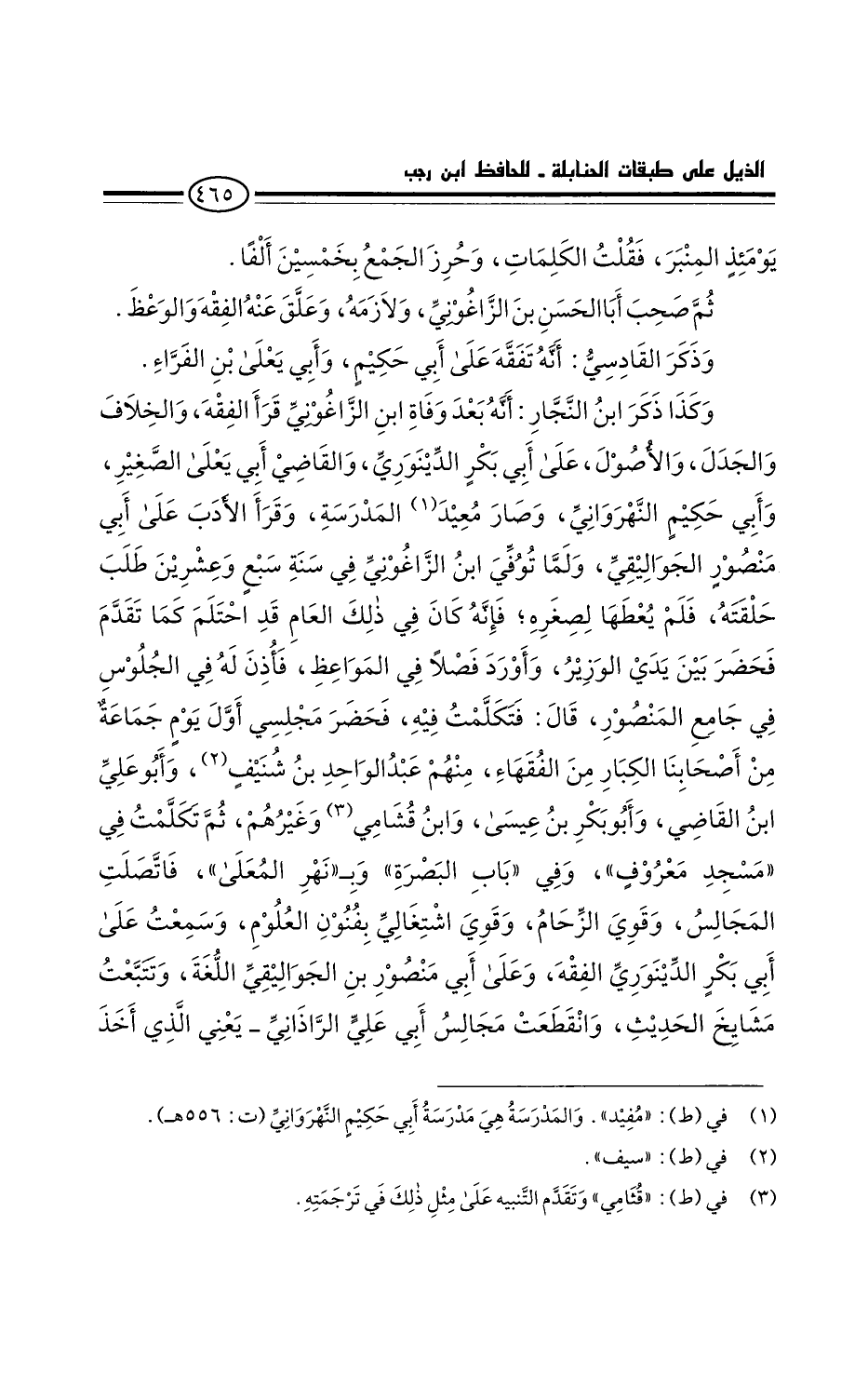 وكذا ذكر ابن النجارة أنه بعد وفاة ابن الزاغوني قرأ الفقه والخلاف والجدل والأصول على أَبِي بَكْرٍ الدينوري، والقاضي أبي يعلى الصغير، وأبي حكيم النهرواني. وصار مفيد المدرسة.