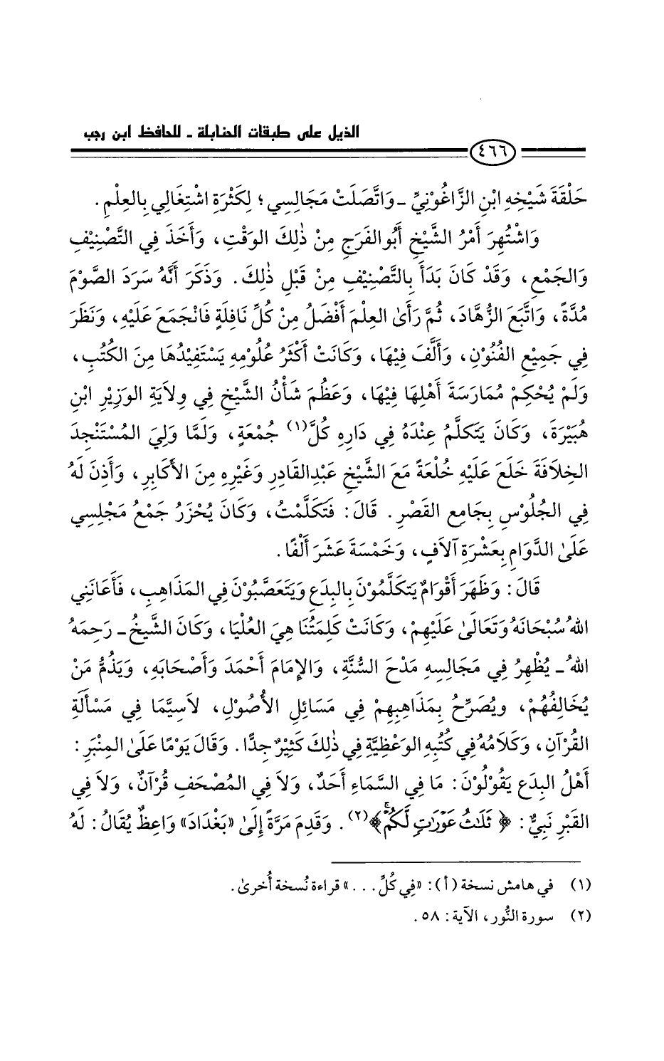 قال: وظهر أقوام يتكلمون بالبدع ويتعصبون في المذاهب، فأعانني الله سبحانه وتعالى عليهم. وكانت كلمتنا هي العليا. وكان الشيخ رحمه الله يظهر في مجالسه مدح السنة، والإمام أحمد وأصحابه، ويذم من يخالفهم، يصرح بمذاهبهم في مسائل الأصل، لا سيما في مسألة القرآن. وكلامه في كتبه الوعظية في ذلك كثير جدا.