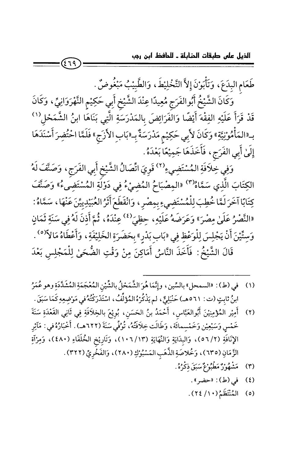 وفي خلافة المستضيء قوي اتصال الشيخ أبي الفرج وصنف له الكتاب الذي سماه " المصباح المضيء في دولة المستضيء " وصنف كتابا آخر لما خطب للمستضيء بمصر، وانقطع أثر العبيديين عنها، سماه: " النصر على مصر " وعرضه علبه، وحضر عنده، ثم أذن له في سنة ثمان وستين أن يجلس للوعظ في باب بدر بحضرة الخليفة، وأعطاه مالا.
