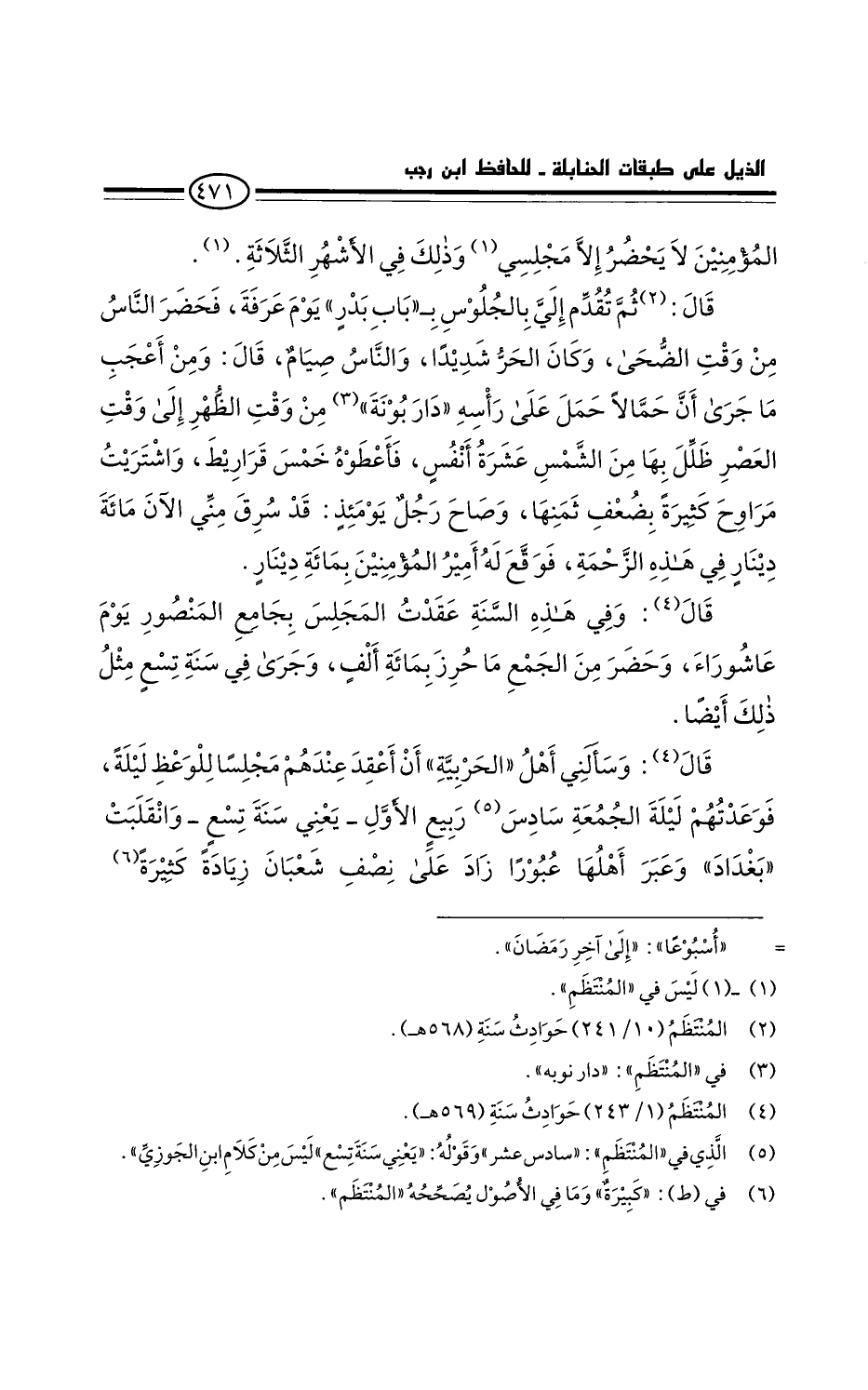 قال: وفي هذه السنة عقدت المجلس بجامع المنصور يوم عاشوراء، وحضر من الجمع ما حرز بمائة ألف، وجرى في سنة تسع مثل ذلك أيضا.