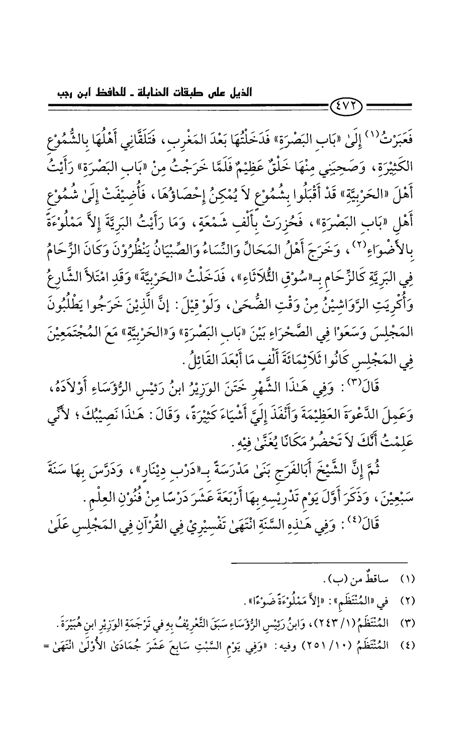 قال: وفي هذا الشهر ختن الوزير رئيس الرؤساء أولاده وعمل الدعوة العظيمة وأنفذ إلي أشياء كثيرة، وقال: هذا نصيبك لأني علمت أنك لا تحضر مكانا يغنى فيه. ثم إن الشيخ أبا الفرج بنى مدرسة بدرب دينار، ودرس بها سنة سبعين. وذكر أول يوم تدريسه بها أربعة عشر درسا من فنون العلم.