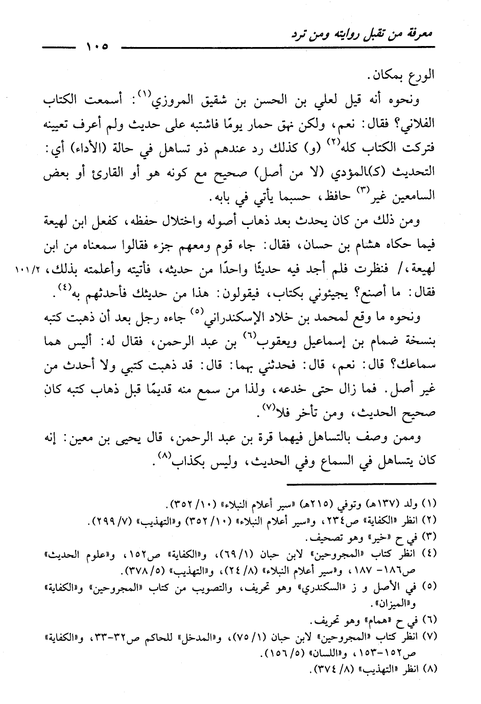 وَنَحْوُهُ أَنَّهُ قِيلَ لِعَلِيِّ بْنِ الْحَسَنِ بْنَ شَقِيقٍ الْمَرْوَزِيِّ: أَسَمِعْتَ الْكِتَابَ الْفُلَانِيَّ؟ فَقَالَ: نَعَمْ، وَلَكِنْ نَهَقَ حِمَارٌ يَوْمًا فَاشْتَبَهَ عَلَيَّ حَدِيثٌ، وَلَمْ أَعْرِفْ تَعْيِينَهُ، فَتَرَكْتُ الْكِتَابَ كُلَّهُ. (وَ) كَذَلِكَ رُدَّ عِنْدَهُمْ ذُو تَسَاهُلٍ فِي حَالَةِ (الْأَدَاءِ) أَيِ: التَّحْدِيثِ (كَ) الْمُؤَدِّي (لَا مِنْ أَصْلٍ) صَحِيحٍ مَعَ كَوْنِهِ هُوَ أَوِ الْقَارِئِ أَوْ بَعْضِ السَّامِعِينَ غَيْرَ حَافِظٍ، حَسْبَمَا يَأْتِي فِي بَابِهِ.