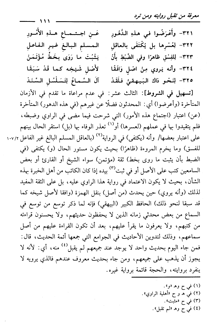 (وَ) يُكْتَفَى (فِي الضَّبْطِ بِأَنْ يَثْبُتَ مَا رَوَى بِخَطِّ) ثِقَةٍ (مُؤْتَمَنٍ) ، سَوَاءٌ الشَّيْخُ أَوِ الْقَارِئُ أَوْ بَعْضُ السَّامِعِينَ كَتَبَ عَلَى الْأَصْلِ أَوْ فِي ثَبْتٍ بِيَدِهِ، إِذَا كَانَ الْكَاتِبُ مِنْ أَهْلِ الْخِبْرَةِ بِهَذِهِ الشَّأْنِ، بِحَيْثُ لَا يَكُونُ الِاعْتِمَادُ فِي رِوَايَةِ هَذَا الرَّاوِي عَلَيْهِ، بَلْ عَلَى الثِّقَةِ الْمُفِيدِ لِذَلِكَ (وَأَنَّهُ يَرْوِي) حِينَ يُحَدِّثُ (مِنْ أَصْلٍ) بِنَقْلِ الْهَمْزَةِ (وَافَقَا لِأَصْلِ شَيْخِهِ كَمَا قَدْ سَبَقَا لِنَحْوِ ذَلِكَ) الْحَافِظُ الْكَبِيرُ (الْبَيْهَقِيُّ) فَإِنَّهُ لَمَّا ذَكَرَ تَوَسُّعَ مَنْ تَوَسَّعَ فِي السَّمَاعِ مِنْ بَعْضِ مُحَدِّثِي زَمَانِهِ الَّذِينَ لَا يَحْفَظُونَ حَدِيثَهُمْ، وَلَا يُحْسِنُونَ قِرَاءَتَهُ مِنْ كُتُبِهِمْ، وَلَا يَعْرِفُونَ مَا يُقْرَأُ عَلَيْهِمْ، بَعْدَ أَنْ تَكُونَ الْقِرَاءَةُ عَلَيْهِمْ مِنْ أَصْلِ سَمَاعِهِمْ، وَذَلِكَ لِتَدْوِينِ الْأَحَادِيثِ فِي الْجَوَامِعِ الَّتِي جَمَعَهَا أَئِمَّةُ الْحَدِيثِ، قَالَ: فَمَنْ جَاءَ الْيَوْمَ بِحَدِيثٍ وَاحِدٍ لَا يُوجَدُ عِنْدَ جَمِيعِهِمْ لَمْ يُقْبَلْ مِنْهُ ; أَيْ: لِأَنَّهُ لَا يَجُوزُ أَنْ يَذْهَبَ عَلَى جَمِيعِهِمْ، وَمَنْ جَاءَ بِحَدِيثٍ مَعْرُوفٍ عِنْدَهُمْ فَالَّذِي يَرْوِيهِ لَا يَنْفَرِدُ بِرِوَايَتِهِ، وَالْحُجَّةُ قَائِمَةٌ بِرِوَايَةِ غَيْرِهِ.