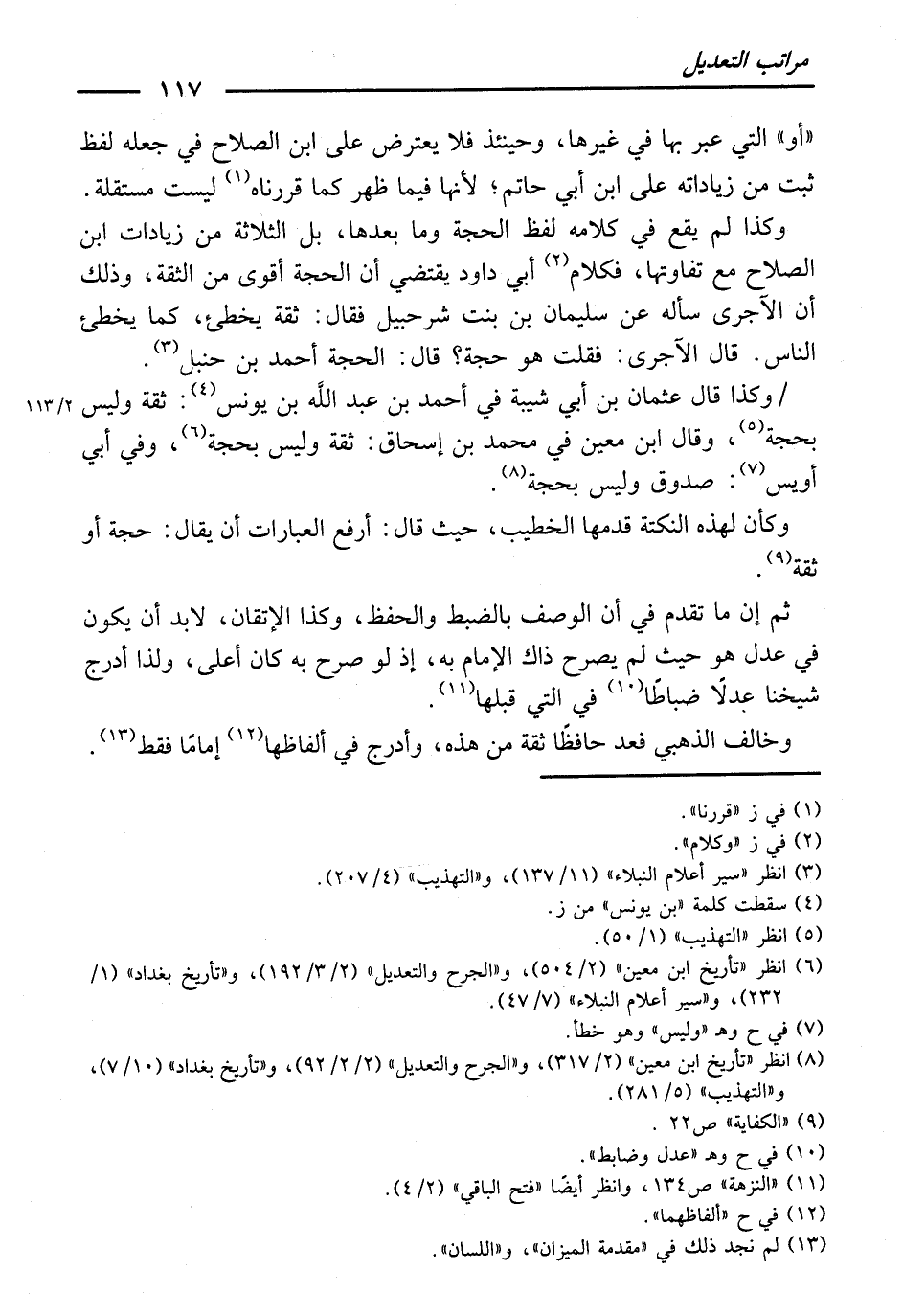 وَكَذَا لَمْ يَقَعْ فِي كَلَامِهِ لَفْظُ الْحُجَّةِ وَمَا بَعْدَهَا، بَلِ الثَّلَاثَةُ مِنْ زِيَادَاتِ ابْنِ الصَّلَاحِ مَعَ تَفَاوُتِهَا، فَكَلَامُ أَبِي دَاوُدَ يَقْتَضِي أَنَّ الْحُجَّةَ أَقْوَى مِنَ الثِّقَةِ، وَذَلِكَ أَنَّ الْآجُرِّيَّ سَأَلَهُ عَنْ سُلَيْمَانَ ابْنِ بِنْتِ شُرَحْبِيلَ، فَقَالَ: " ثِقَةٌ يُخْطِئُ، كَمَا يُخْطِئُ النَّاسُ، قَالَ الْآجُرِّيُّ: فَقُلْتُ: هُوَ حُجَّةٌ؟ قَالَ: الْحُجَّةُ أَحْمَدُ بْنُ حَنْبَلٍ ".