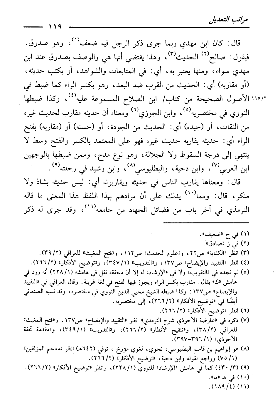 قَالَ: كَانَ ابْنُ مَهْدِيٍّ رُبَّمَا جَرَى ذِكْرُ الرَّجُلِ فِيهِ ضَعْفٌ، وَهُوَ صَدُوقٌ، فَيَقُولُ: صَالِحُ الْحَدِيثِ. وَهَذَا يَقْتَضِي أَنَّهَا هِيَ وَالْوَصْفُ بِصَدُوقٍ عِنْدَ ابْنِ مَهْدِيٍّ سَوَاءٌ. وَمِنْهَا: يُعْتَبَرُ بِهِ ; أَيْ: فِي الْمُتَابَعَاتِ وَالشَّوَاهِدِ، أَوْ: يُكْتَبُ حَدِيثُهُ (أَوْ مُقَارِبُهُ) أَيِ: الْحَدِيثِ، مِنَ الْقُرْبِ ضِدِّ الْبُعْدِ، وَهُوَ بِكَسْرِ الرَّاءِ كَمَا ضُبِطَ فِي الْأُصُولِ الصَّحِيحَةِ مِنْ كِتَابِ ابْنِ الصَّلَاحِ الْمَسْمُوعَةِ عَلَيْهِ، وَكَذَا ضَبَطَهَا النَّوَوِيُّ فِي مُخْتَصَرَيْهِ، وَابْنُ الْجَوْزِيِّ، وَمَعْنَاهُ أَنَّ حَدِيثَهُ مُقَارِبٌ لِحَدِيثِ غَيْرِهِ مِنَ الثِّقَاتِ، أَوْ (جَيِّدُهُ) أَيِ: الْحَدِيثِ مِنَ الْجَوْدَةِ، أَوْ (حَسَنُهُ) ، أَوْ (مُقَارَبُهْ) بِفَتْحِ الرَّاءِ ; أَيْ: حَدِيثُهُ يُقَارِبُهُ حَدِيثُ غَيْرِهِ، فَهُوَ عَلَى الْمُعْتَمَدِ، بِالْكَسْرِ وَالْفَتْحِ، وَسَطٌ لَا يَنْتَهِي إِلَى دَرَجَةِ السُّقُوطِ وَلَا الْجَلَالَةِ، وَهُوَ نَوْعُ مَدْحٍ، وَمِمَّنْ ضَبَطَهَا بِالْوَجْهَيْنِ ابْنُ الْعَرَبِيِّ، وَابْنُ دِحْيَةَ، وَالْبَطْلَيُوسِيُّ، وَابْنُ رُشَيْدٍ فِي رِحْلَتِهِ.