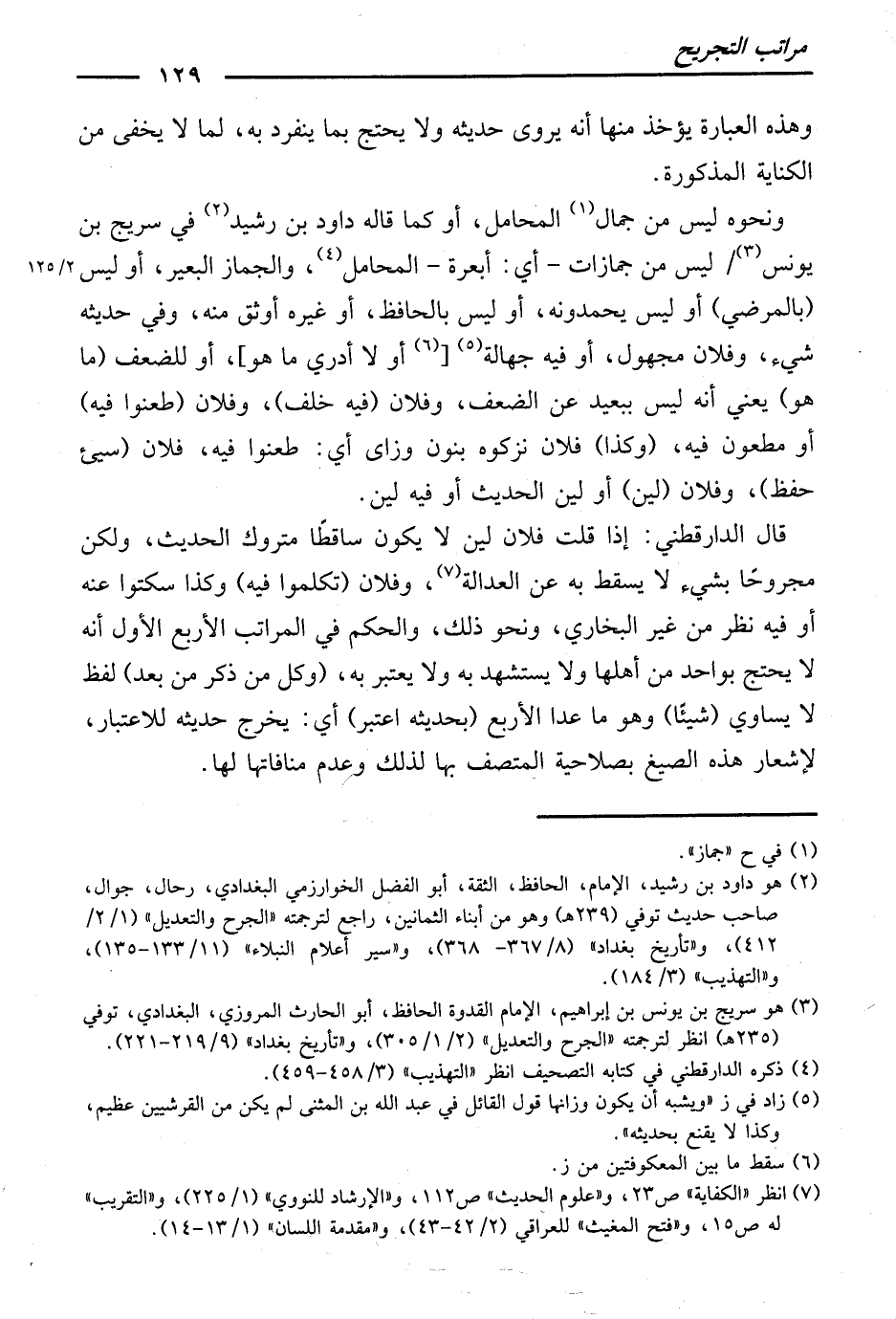 قَالَ الدَّارَقُطْنِيُّ: إِذَا قُلْتُ: فُلَانٌ لَيِّنٌ لَا يَكُونُ سَاقِطًا مَتْرُوكَ الْحَدِيثِ، وَلَكِنْ مَجْرُوحًا بِشَيْءٍ لَا يَسْقُطُ بِهِ عَنِ الْعَدَالَةِ. وَفُلَانٌ (تَكَلَّمُوا فِيهِ) ، وَكَذَا سَكَتُوا عَنْهُ، أَوْ فِيهِ نَظَرٌ مِنْ غَيْرِ الْبُخَارِيِّ، وَنَحْوُ ذَلِكَ. وَالْحُكْمُ فِي الْمَرَاتِبِ الْأَرْبَعِ الْأُوَلِ أَنَّهُ لَا يُحْتَجُّ بِوَاحِدٍ مِنْ أَهْلِهَا، وَلَا يُسْتَشْهَدُ بِهِ، وَلَا يُعْتَبَرُ بِهِ (وَكُلُّ مَنْ ذُكِرْ مِنْ بَعْدِ) لَفْظِ: لَا يُسَاوِي (شَيْئًا) ، وَهُوَ مَا عَدَا الْأَرْبَعَ (بِحَدِيثِهِ اعْتُبِرْ) أَيْ: يُخَرَّجُ حَدِيثُهُ لِلِاعْتِبَارِ ; لِإِشْعَارِ هَذِهِ الصِّيَغِ بِصَلَاحِيَةِ الْمُتَّصِفِ بِهَا لِذَلِكَ، وَعَدَمِ مُنَافَاتِهَا لَهَا.