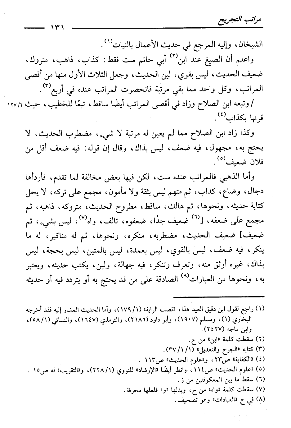وَاعْلَمْ أَنَّ الصِّيَغَ عِنْدَ ابْنِ أَبِي حَاتِمٍ سِتٌّ فَقَطْ: كَذَّابٌ، ذَاهِبٌ، مَتْرُوكٌ، ضَعِيفُ الْحَدِيثِ، لَيْسَ بِقَوِيٍّ، لَيِّنُ الْحَدِيثِ، وَجَعَلَ الثَّلَاثَ الْأُوَلَ مِنْهَا مِنْ أَقْصَى الْمَرَاتِبِ، وَكُلُّ وَاحِدٍ مِمَّا بَقِيَ مَرْتَبَةً، فَانْحَصَرَتِ الْمَرَاتِبُ عِنْدَهُ فِي أَرْبَعٍ.
