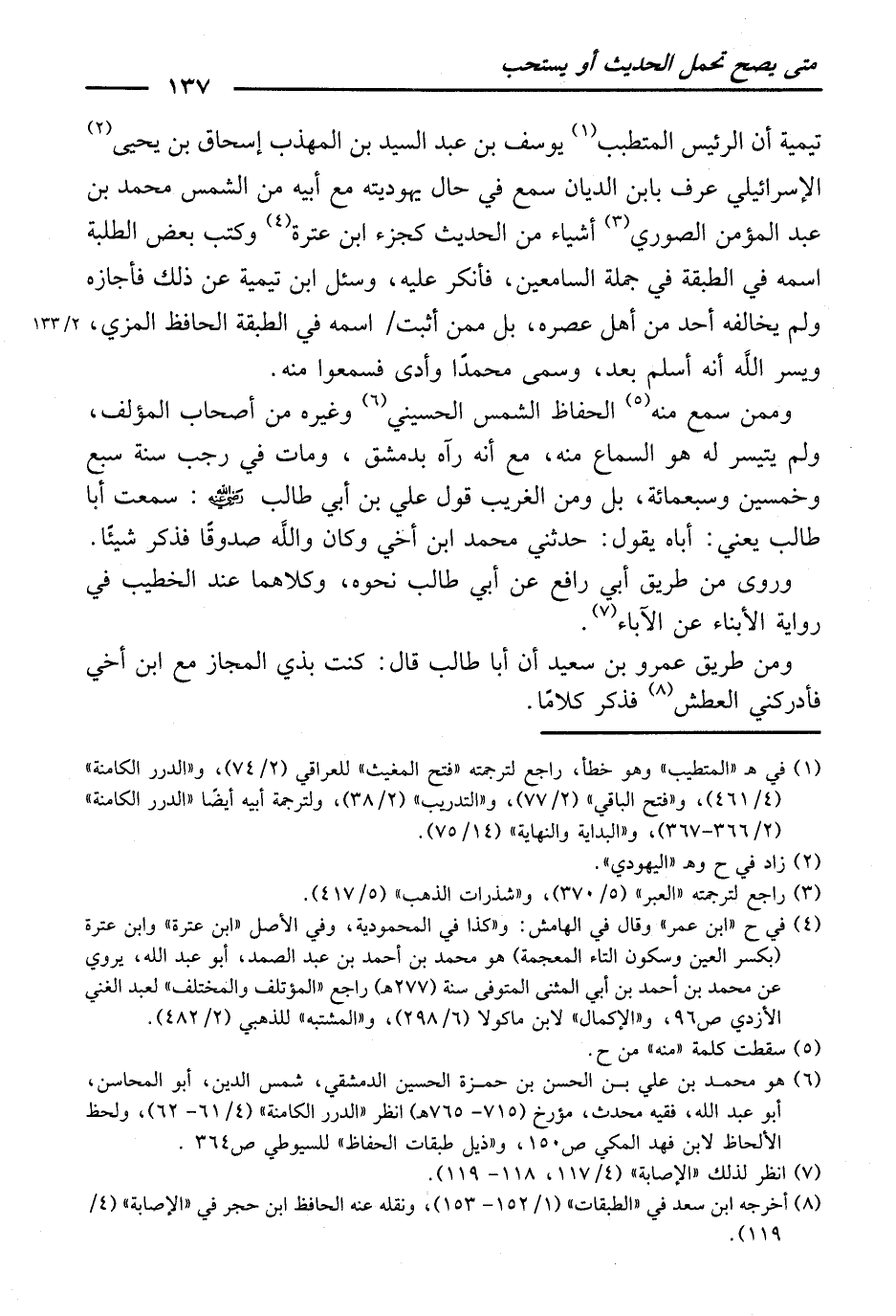 وَسُئِلَ ابْنُ تَيْمِيَّةَ عَنْ ذَلِكَ، فَأَجَازَهُ، وَلَمْ يُخَالِفْهُ أَحَدٌ مِنْ أَهْلِ عَصْرِهِ، بَلْ مِمَّنْ أَثْبَتَ اسْمَهُ فِي الطَّبَقَةِ الْحَافِظُ الْمِزِّيُّ، وَيَسَّرَ اللَّهُ أَنَّهُ أَسْلَمَ بَعْدُ، وَسُمِّيَ مُحَمَّدًا، وَأَدَّى فَسَمِعُوا مِنْهُ.