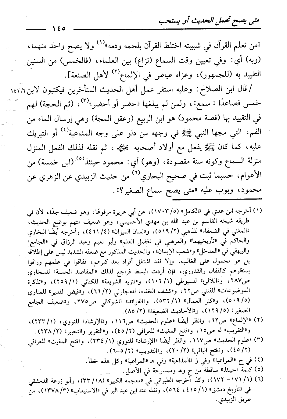 (وَبِهِ) أَيْ: وَفِي تَعْيِينِ وَقْتِ السَّمَاعِ (نِزَاعُ) بَيْنَ الْعُلَمَاءِ (فَالْخَمْسُ) مِنَ السِّنِينَ التَّقْيِيدُ بِهِ (لِلْجُمْهُورِ) ، وَعَزَاهُ عِيَاضٌ فِي الْإِلْمَاعِ لِأَهْلِ الصَّنْعَةِ.