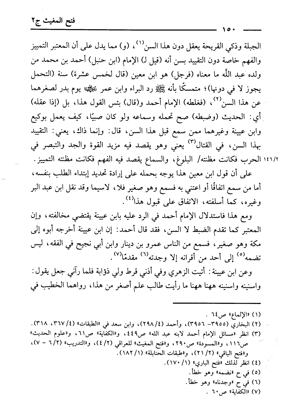 (وَ) مِمَّا يَدُلُّ عَلَى أَنَّ الْمُعْتَبَرَ التَّمْيِيزُ وَالْفَهْمُ خَاصَّةً دُونَ التَّقْيِيدِ بِسِنٍّ، أَنَّهُ قِيلَ لِلْإِمَامِ (ابْنِ حَنْبَلٍ) أَحْمَدَ بْنِ مُحَمَّدٍ مِنْ وَلَدِهِ عَبْدِ اللَّهِ مَا مَعْنَاهُ: (فَرَجُلٌ) ، هُوَ ابْنُ مَعِينٍ (قَالَ لِخَمْسَ عَشْرَةَ) سَنَةً (التَّحَمُّلُ يَجُوزُ لَا فِي دُونِهَا) مُتَمَسِّكًا بِأَنَّهُ «صَلَّى اللَّهُ عَلَيْهِ وَسَلَّمَ رَدَّ الْبَرَاءَ وَابْنَ عُمَرَ رَضِيَ اللَّهُ عَنْهُمَا يَوْمَ بَدْرٍ لِصِغَرِهِمَا» عَنْ هَذَا السِّنِّ (فَغَلَّطَهْ) الْإِمَامُ أَحْمَدُ، وَ (قَالَ) : بِئْسَ الْقَوْلُ هَذَا، بَلْ (إِذَا عَقَلَهُ) أَيِ: الْحَدِيثَ (وَضَبَطَهْ) صَحَّ تَحَمُّلُهُ وَسَمَاعُهُ وَلَوْ كَانَ صَبِيًّا، كَيْفَ يُعْمَلُ بِوَكِيعٍ وَابْنِ عُيَيْنَةَ وَغَيْرِهِمَا مِمَّنْ سَمِعَ قَبْلَ هَذَا السَّنِّ، قَالَ: وَإِنَّمَا ذَاكَ، يَعْنِي التَّقْيِيدَ بِهَذَا السِّنِّ، فِي الْقِتَالِ، يَعْنِي وَهُوَ يَقْصِدُ فِيهِ مَزِيدَ الْقُوَّةِ وَالْجِدِّ وَالتَّبَصُّرِ فِي الْحَرْبِ، فَكَانَتْ مَظَنَّتُهُ الْبُلُوغَ، وَالسَّمَاعُ يُقْصَدُ فِيهِ الْفَهْمُ، فَكَانَتْ مَظَنَّتُهُ التَّمْيِيزَ.