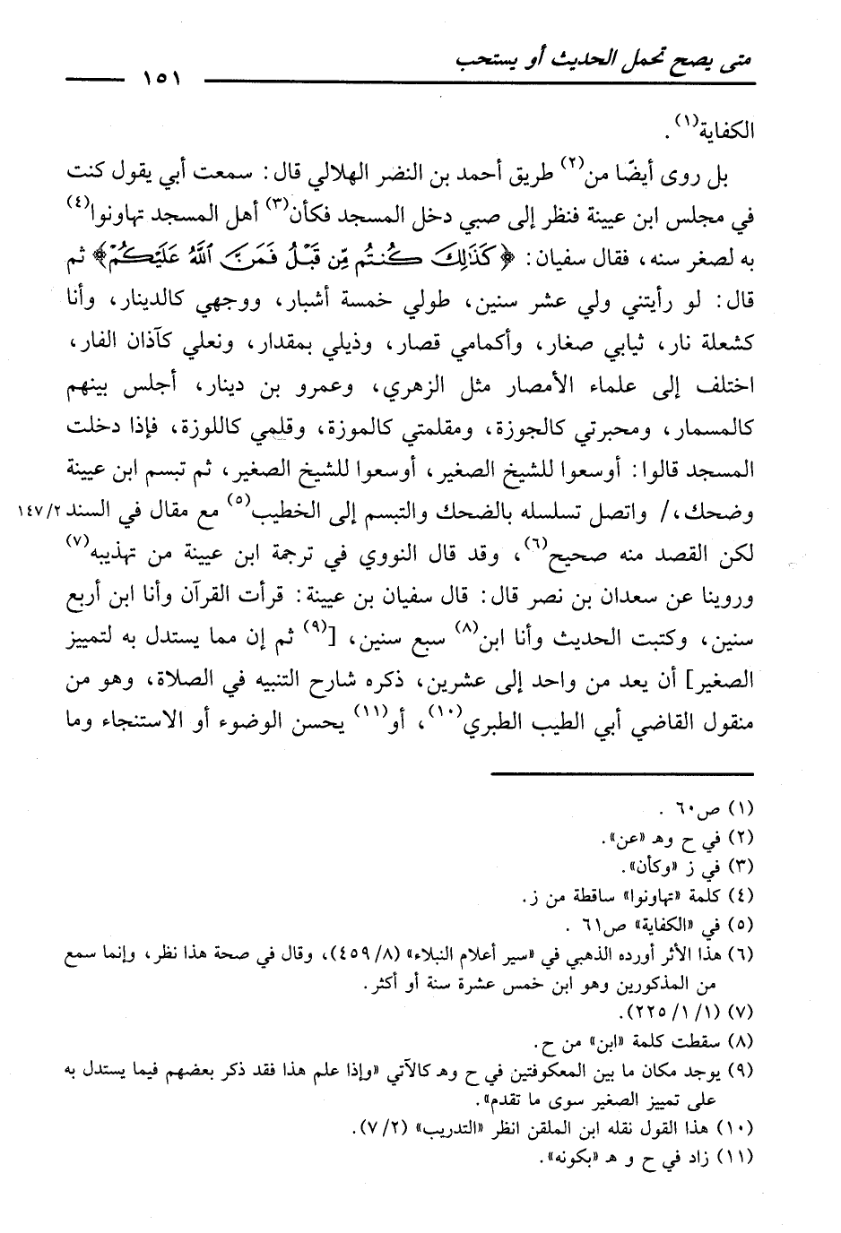 ثُمَّ تَبَسَّمَ ابْنُ عُيَيْنَةَ وَضَحِكَ، وَاتَّصَلَ تَسَلْسُلُهُ بِالضَّحِكِ وَالتَّبَسُّمِ إِلَى الْخَطِيبِ، مَعَ مَقَالٍ فِي السَّنَدِ، لَكِنَّ الْقَصْدَ مِنْهُ صَحِيحٌ. وَقَدْ قَالَ النَّوَوِيُّ فِي تَرْجَمَةِ ابْنِ عُيَيْنَةَ مِنْ تَهْذِيبِهِ: وَرُوِّينَا عَنْ سَعْدَانَ بْنِ نَصْرٍ قَالَ: قَالَ سُفْيَانُ بْنُ عُيَيْنَةَ: قَرَأْتُ الْقُرْآنَ وَأَنَا ابْنُ أَرْبَعِ سِنِينَ، وَكَتَبْتُ الْحَدِيثَ وَأَنَا ابْنُ سَبْعِ سِنِينَ. [ثُمَّ إِنَّ مِمَّا يُسْتَدَلُّ بِهِ لِتَمْيِيزِ الصَّغِيرِ] أَنْ يَعِدَّ مِنْ وَاحِدٍ إِلَى عِشْرِينَ، ذَكَرَهُ شَارِحُ التَّنْبِيهِ فِي الصَّلَاةِ، وَهُوَ مِنْ مَنْقُولِ الْقَاضِي أَبِي الطَّيِّبِ الطَّبَرِيِّ، أَوْ يُحْسِنُ الْوُضُوءَ أَوِ الِاسْتِنْجَاءَ وَمَا