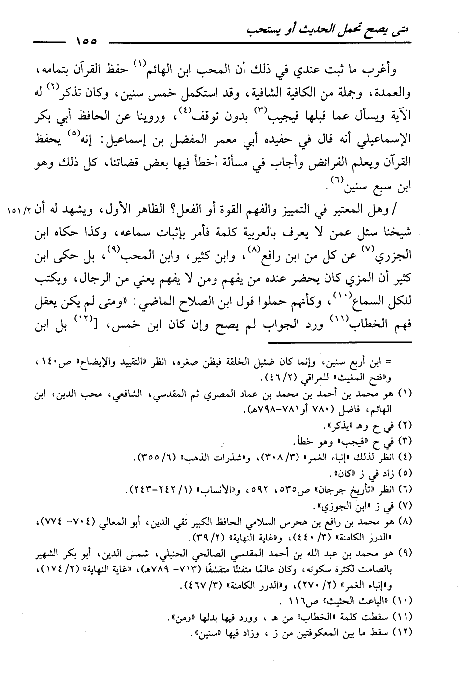 وَأَغْرَبُ مَا ثَبَتَ عِنْدِي فِي ذَلِكَ، أَنَّ الْمُحِبَّ بْنَ الْهَائِمِ حَفِظَ الْقُرْآنَ بِتَمَامِهِ، وَ (الْعُمْدَةَ) ، وَجُمْلَةً مِنَ (الْكَافِيَةِ الشَّافِيَةِ) ، وَقَدِ اسْتَكْمَلَ خَمْسَ سِنِينَ، وَكَانَ تُذْكَرُ لَهُ الْآيَةُ وَيُسْأَلُ عَمَّا قَبْلَهَا فَيُجِيبُ بِدُونِ تَوَقُّفٍ. وَرُوِّينَا عَنِ الْحَافِظِ أَبِي بَكْرٍ الْإِسْمَاعِيلِيِّ أَنَّهُ قَالَ فِي حَفِيدِهِ أَبِي مَعْمَرٍ الْمُفَضَّلِ بْنِ إِسْمَاعِيلَ: إِنَّهُ يَحْفَظُ الْقُرْآنَ وَيَعْلَمُ الْفَرَائِضَ، وَأَجَابَ فِي مَسْأَلَةٍ أَخْطَأَ فِيهَا بَعْضُ قُضَاتِنَا، كُلُّ ذَلِكَ وَهُوَ ابْنُ سَبْعِ سِنِينَ.