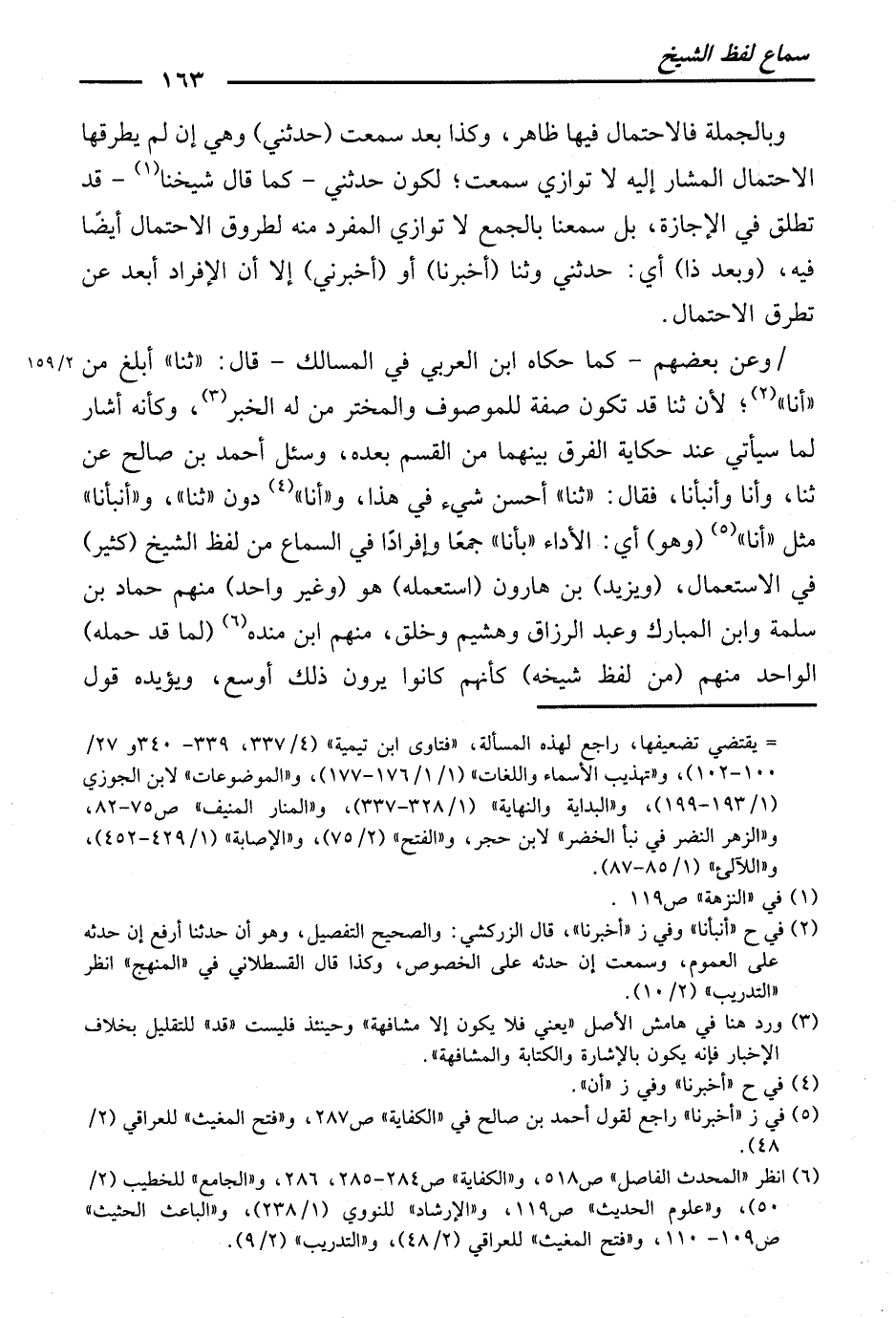 وَسُئِلَ أَحْمَدُ بْنُ صَالِحٍ عَنْ ثَنَا وَأَنَا وَأَنْبَأَنَا، فَقَالَ: " ثَنَا " أَحْسَنُ شَيْءٍ فِي هَذَا، وَ " أَنَا " دُونَ " ثَنَا "، وَ " أَنْبَأَنَا " مِثْلُ " أَنَا ". (وَهْوَ) أَيِ: الْأَدَاءُ " بِأَنَا " جَمْعًا وَإِفْرَادًا فِي السَّمَاعِ مِنْ لَفْظِ الشَّيْخِ (كَثِيرٌ) فِي الِاسْتِعْمَالِ (وَيَزِيدُ) بْنُ هَارُونَ (اسْتَعْمَلَهُ) هُوَ (وَغَيْرُ وَاحِدٍ) ، مِنْهُمْ حَمَّادُ بْنُ سَلَمَةَ وَابْنُ الْمُبَارَكِ وَعَبْدُ الرَّزَّاقِ وَهُشَيْمٌ وَخَلْقٌ، مِنْهُمُ ابْنُ مَنْدَهْ (لِمَا قَدْ حَمَلَهْ) الْوَاحِدُ مِنْهُمْ (مِنْ لَفْظِ شَيْخِهِ) ، كَأَنَّهُمْ كَانُوا يَرَوْنَ ذَلِكَ أَوْسَعَ. وَيُؤَيِّدُهُ قَوْلُ