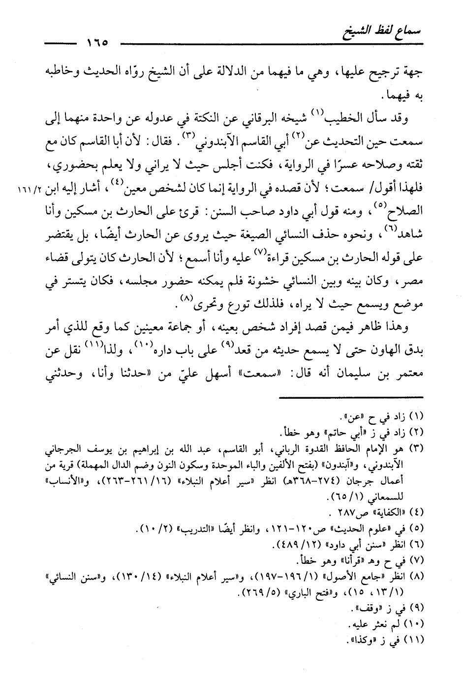 وَقَدْ سَأَلَ الْخَطِيبُ شَيْخَهُ الْبَرْقَانِيَّ عَنِ النُّكْتَةِ فِي عُدُولِهِ عَنْ وَاحِدَةٍ مِنْهُمَا إِلَى سَمِعْتُ حِينَ التَّحْدِيثِ عَنْ أَبِي الْقَاسِمِ الْآبَنْدُونِيِّ، فَقَالَ: لِأَنَّ أَبَا الْقَاسِمِ كَانَ مَعَ ثِقَتِهِ وَصَلَاحِهِ عَسِرًا فِي الرِّوَايَةِ، فَكُنْتُ أَجْلِسُ حَيْثُ لَا يَرَانِي وَلَا يَعْلَمُ بِحُضُورِي، فَلِهَذَا أَقُولُ: سَمِعْتُ ; لِأَنَّ قَصْدَهُ فِي الرِّوَايَةِ إِنَّمَا كَانَ لِشَخْصٍ مُعَيَّنٍ، أَشَارَ إِلَيْهِ ابْنُ الصَّلَاحِ، وَمِنْهُ قَوْلُ أَبِي دَاوُدَ صَاحِبِ السُّنَنِ: قُرِئَ عَلَى الْحَارِثِ بْنِ مِسْكِينٍ وَأَنَا شَاهِدٌ. وَنَحْوُهُ حَذَفَ النَّسَائِيُّ الصِّيغَةَ، حَيْثُ يَرْوِي عَنِ الْحَارِثِ أَيْضًا، بَلْ يَقْتَصِرُ عَلَى قَوْلِهِ: الْحَارِثُ بْنُ مِسْكِينٍ قِرَاءَةً عَلَيْهِ وَأَنَا أَسْمَعُ ; لِأَنَّ الْحَارِثَ كَانَ يَتَوَلَّى قَضَاءَ مِصْرَ، وَكَانَ بَيْنَهُ وَبَيْنَ النَّسَائِيِّ خُشُونَةٌ، فَلَمْ يُمْكِنْهُ حُضُورُ مَجْلِسِهِ، فَكَانَ يَتَسَتَّرُ فِي مَوْضِعٍ وَيَسْمَعُ حَيْثُ لَا يَرَاهُ، فَلِذَلِكَ تَوَرَّعَ وَتَحَرَّى.