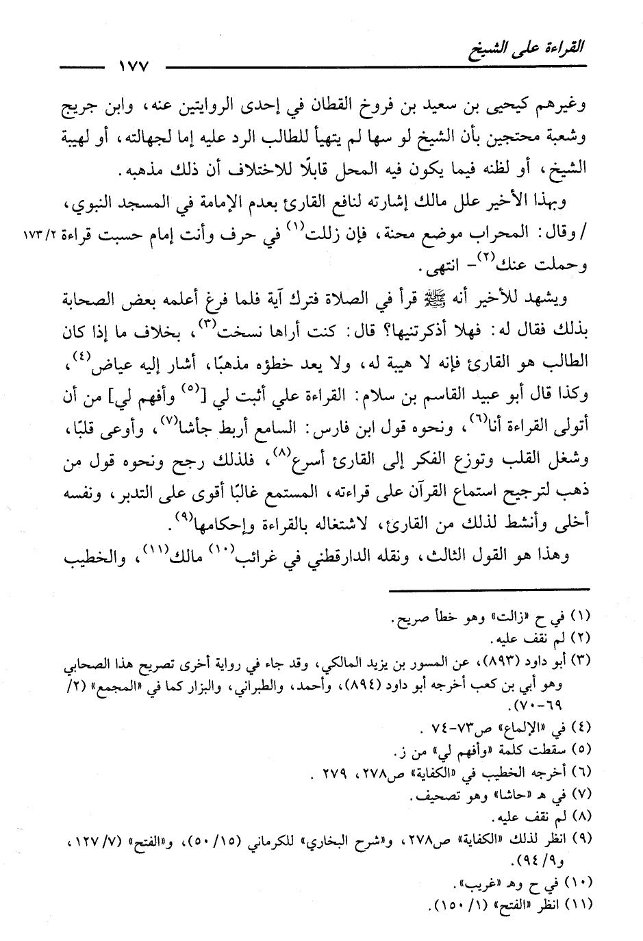 وَيَشْهَدُ لِلْأَخِيرِ «أَنَّهُ صَلَّى اللَّهُ عَلَيْهِ وَسَلَّمَ قَرَأَ فِي صَلَاةٍ فَتَرَكَ آيَةً، فَلَمَّا فَرَغَ أَعْلَمَهُ بَعْضُ الصَّحَابَةِ بِذَلِكَ، فَقَالَ لَهُ: ((فَهَلَّا أَذْكَرْتِنِيهَا؟)) قَالَ: كُنْتُ أُرَاهَا نُسِخَتْ» . بِخِلَافِ مَا إِذَا كَانَ الطَّالِبُ هُوَ الْقَارِئَ ; فَإِنَّهُ لَا هَيْبَةَ لَهُ، وَلَا يُعَدُّ خَطَؤُهُ مَذْهَبًا، أَشَارَ إِلَيْهِ عِيَاضٌ. وَكَذَا قَالَ أَبُو عُبَيْدٍ الْقَاسِمُ بْنُ سَلَامٍ: الْقِرَاءَةُ عَلَيَّ أَثْبَتُ لِي، [وَأَفْهَمُ لِي] ، مِنْ أَنْ أَتَوَلَّى الْقِرَاءَةَ أَنَا.