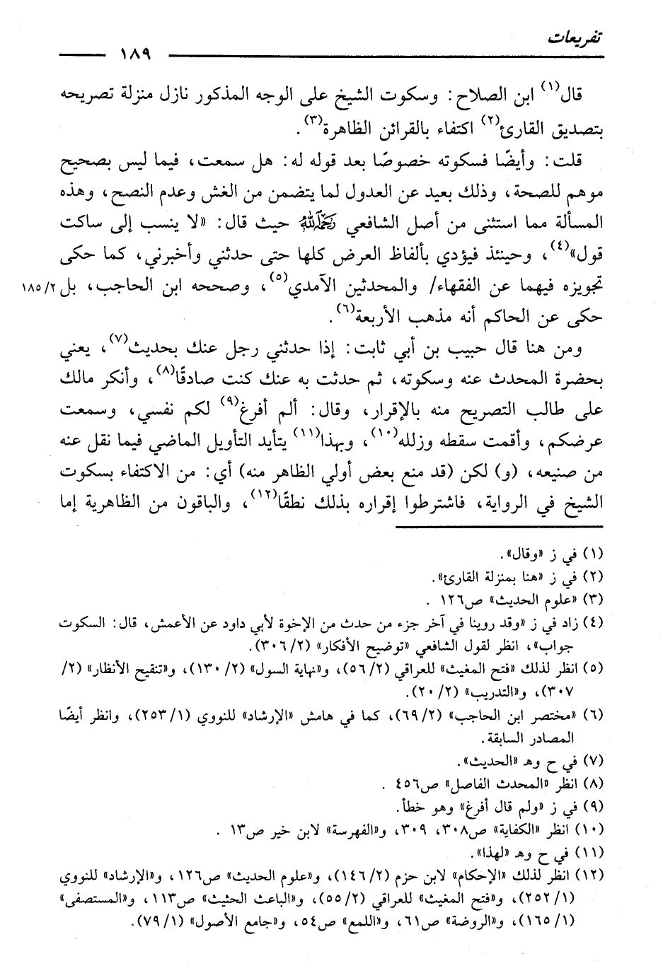قَالَ ابْنُ الصَّلَاحِ: وَسُكُوتُ الشَّيْخِ عَلَى الْوَجْهِ الْمَذْكُورِ نَازِلٌ مَنْزِلَةَ تَصْرِيحِهِ بِتَصْدِيقِ الْقَارِئِ اكْتِفَاءً بِالْقَرَائِنِ الظَّاهِرَةِ.