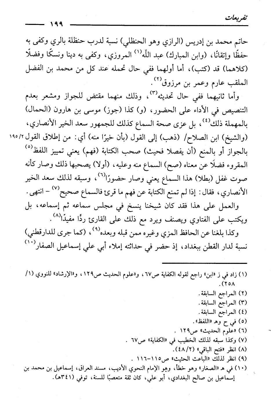 حَاتِمٍ مُحَمَّدُ بْنُ إِدْرِيسَ (الرَّازِيُّ وَهْوَ الْحَنْظَلِيُّ) نِسْبَةً لِدَرْبِ حَنْظَلَةَ بِالرَّيِّ، وَكَفَى بِهِ حِفْظًا وَإِتِقْانًا (وَابْنُ الْمُبَارَكِ) عَبْدُ اللَّهِ الْمَرْوَزِيُّ، وَكَفَى بِهِ دِينًا وَنُسُكًا وَفَضْلًا (كِلَاهُمَا) قَدْ (كَتَبْ) . أَمَّا أَوَّلُهُمَا فَفِي حَالِ تَحَمُّلِهِ عِنْدَ كُلِّ مِنْ مُحَمَّدِ بْنِ الْفَضْلِ الْمُلَقَّبِ عَارِمٍ وَعُمَرَ بْنِ مَرْزُوقٍ.