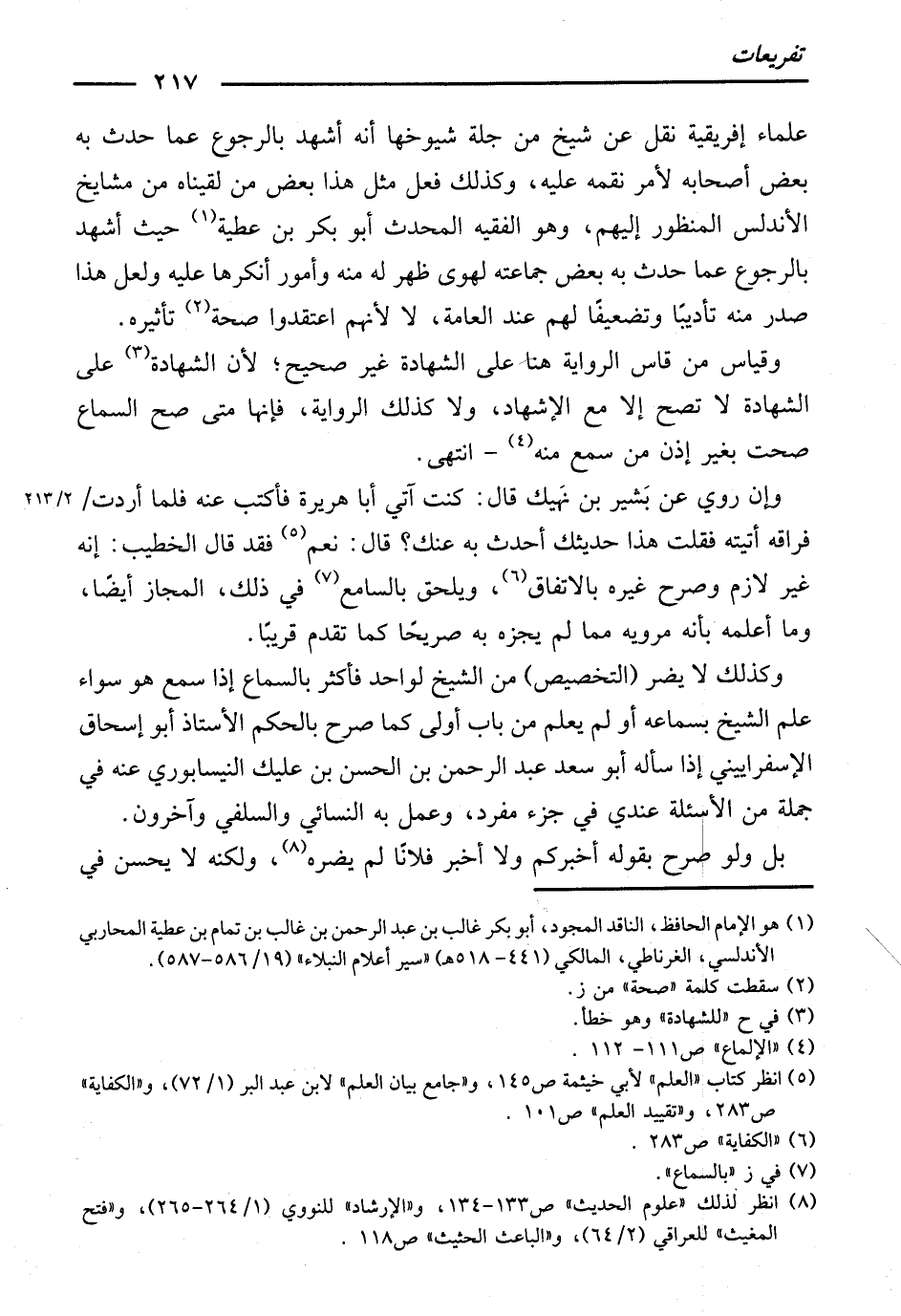 عُلَمَاءِ أَفْرِيقِيَّةَ نَقَلَ عَنْ شَيْخٍ مِنْ جِلَّةِ شُيُوخِهَا أَنَّهُ أَشْهَدَ بِالرُّجُوعِ عَمَّا حَدَّثَ بِهِ بَعْضَ أَصْحَابِهِ لِأَمْرٍ نَقَمَهُ عَلَيْهِ، وَكَذَلِكَ فَعَلَ مِثْلُ هَذَا بَعْضُ مَنْ لَقِينَاهُ مِنْ مَشَايِخِ الْأَنْدَلُسِ الْمَنْظُورِ إِلَيْهِمْ، وَهُوَ الْفَقِيهُ الْمُحَدِّثُ أَبُو بَكْرِ بْنُ عَطِيَّةَ ; حَيْثُ أَشْهَدَ بِالرُّجُوعِ عَمَّا حَدَّثَ بِهِ بَعْضَ جَمَاعَتِهِ لِهَوًى ظَهَرَ لَهُ مِنْهُ، وَأُمُورٍ أَنْكَرَهَا عَلَيْهِ. وَلَعَلَّ هَذَا صَدَرَ مِنْهُمْ تَأْدِيبًا وَتَضْعِيفًا لَهُمْ عِنْدَ الْعَامَّةِ، لَا لِأَنَّهُمُ اعْتَقَدُوا صِحَّةَ تَأْثِيرِهِ.
