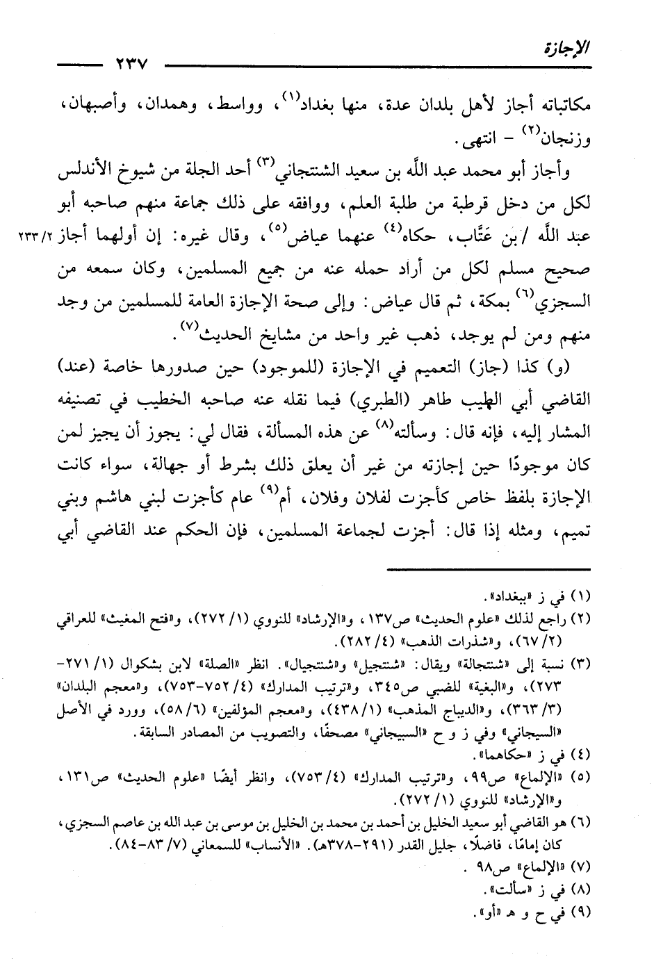 وَأَجَازَ أَبُو مُحَمَّدٍ عَبْدُ اللَّهِ بْنُ سَعِيدٍ الشِّنْتَجَانِيُّ، أَحَدُ الْجُلَّةِ مِنْ شُيُوخِ الْأَنْدَلُسِ، لِكُلِّ مَنْ دَخَلَ قُرْطُبَةَ مِنْ طَلَبَةِ الْعِلْمِ، وَوَافَقَهُ عَلَى ذَلِكَ جَمَاعَةٌ، مِنْهُمْ صَاحِبُهُ أَبُو عَبْدِ اللَّهِ بْنُ عَتَّابٍ، حَكَاهُ عَنْهُمَا عِيَاضٌ، وَقَالَ غَيْرُهُ: إِنَّ أَوَّلَهُمَا أَجَازَ (صَحِيحَ مُسْلِمٍ) لِكُلِّ مَنْ أَرَادَ حَمْلَهُ عَنْهُ مِنْ جَمِيعِ الْمُسْلِمِينَ، وَكَانَ سَمِعَهُ مِنَ السِّجْزِيِّ بِمَكَّةَ، ثُمَّ قَالَ عِيَاضٌ: وَإِلَى صِحَّةِ الْإِجَازَةِ الْعَامَّةِ لِلْمُسْلِمِينَ، مَنْ وُجِدَ مِنْهُمْ وَمَنْ لَمْ يُوجَدْ، ذَهَبَ غَيْرُ وَاحِدٍ مِنْ مَشَايِخِ الْحَدِيثِ.
