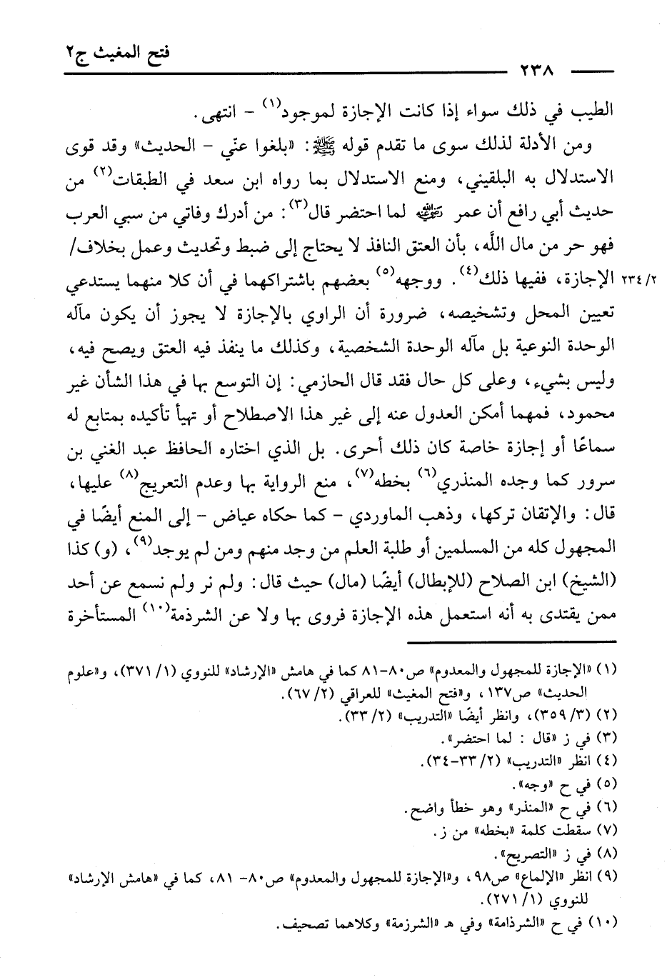 وَمِنِ الْأَدِلَّةِ لِذَلِكَ سِوَى مَا تَقَدَّمَ قَوْلُهُ صَلَّى اللَّهُ عَلَيْهِ وَسَلَّمَ: (( «بَلِّغُوا عَنِّي» )) الْحَدِيثَ. وَقَدْ قَوَّى الِاسْتِدْلَالَ بِهِ الْبُلْقِينِيُّ، وَمَنَعَ الِاسْتِدْلَالَ بِمَا رَوَاهُ ابْنُ سَعْدٍ فِي الطَّبَقَاتِ مِنْ حَدِيثِ أَبِي رَافِعٍ أَنَّ عُمَرَ رَضِيَ اللَّهُ عَنْهُ لَمَّا احْتُضِرَ قَالَ: «مَنْ أَدْرَكَ وَفَاتِي مِنْ سَبْيِ الْعَرَبِ فَهُوَ حُرٌّ مِنْ مَالِ اللَّهِ» ، بِأَنَّ الْعِتْقَ النَّافِذَ لَا يَحْتَاجُ إِلَى ضَبْطٍ وَتَحْدِيثٍ وَعَمَلٍ بِخِلَافِ الْإِجَازَةِ، فَفِيهَا ذَلِكَ. وَوَجَّهَهُ بَعْضُهُمْ بِاشْتِرَاكِهِمَا فِي أَنَّ كُلًّا مِنْهُمَا يَسْتَدْعِي تَعْيِينَ الْمَحَلِّ وَتَشْخِيصَهُ، ضَرُورَةَ أَنَّ الرَّاوِيَ بِالْإِجَازَةِ لَا يَجُوزُ أَنْ يَكُونَ مَآلُهُ الْوَحْدَةَ النَّوْعِيَّةَ، بَلْ مَآلُهُ الْوَحْدَةُ الشَّخْصِيَّةُ.