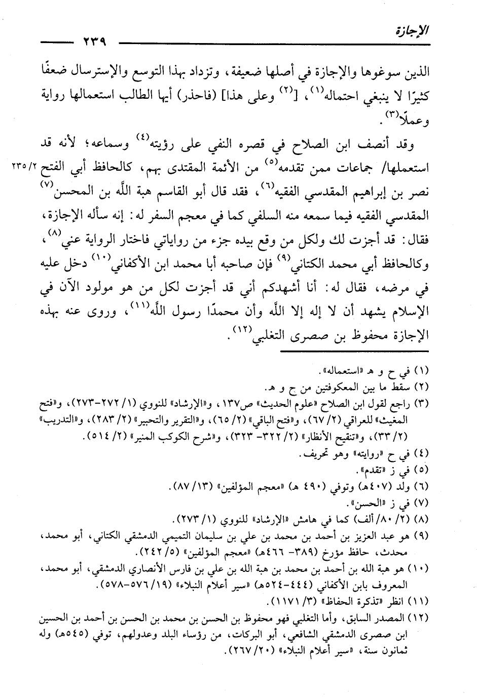 وَقَدْ أَنْصَفَ ابْنُ الصَّلَاحِ فِي قَصْرِهِ النَّفْيَ عَلَى رُؤْيَتِهِ وَسَمَاعِهِ ; لِأَنَّهُ قَدِ اسْتَعْمَلَهَا جَمَاعَاتٌ مِمَّنْ تَقَدَّمَهُ مِنَ الْأَئِمَّةِ الْمُقْتَدَى بِهِمْ، كَالْحَافِظِ أَبِي الْفَتْحِ نَصْرِ بْنِ إِبْرَاهِيمَ الْمَقْدِسِيِّ الْفَقِيهِ، فَقَدْ قَالَ أَبُو الْقَاسِمِ هِبَةُ اللَّهِ بْنُ الْمُحْسِنِ الْمَقْدِسِيُّ الْفَقِيهُ فِيمَا سَمِعَهُ مِنْهُ السِّلَفِيُّ كَمَا فِي مُعْجَمِ السَّفَرِ لَهُ: إِنَّهُ سَأَلَهُ الْإِجَازَةَ، فَقَالَ: قَدْ أَجَزْتُ لَكَ، وَلِكُلِّ مَنْ وَقَعَ بِيَدِهِ جُزْءٌ مِنْ رِوَايَاتِي فَاخْتَارَ الرِّوَايَةَ عَنِّي.