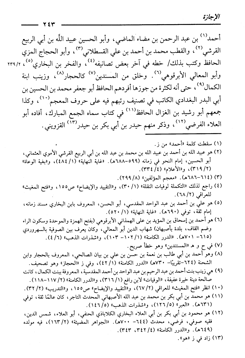 أَحْمَدُ بْنُ عَبْدِ الرَّحْمَنِ بْنِ مَضَاءٍ الْمَاضِي، وَأَبُو الْحُسَيْنِ عُبَيْدُ اللَّهِ بْنُ أَبِي الرَّبِيعِ الْقُرَشِيُّ، وَالْقُطْبُ مُحَمَّدُ بْنُ أَحْمَدَ بْنِ عَلِيٍّ الْقَسْطَلَانِيُّ، وَأَبُو الْحَجَّاجِ الْمِزِّيُّ الْحَافِظُ، وَكَتَبَ بِذَلِكَ خَطَّهُ فِي آخِرِ بَعْضِ تَصَانِيفِهِ، وَالْفَخْرُ بْنُ الْبُخَارِيِّ، وَأَبُو الْمَعَالِي الْأَبَرْقُوهِيُّ، وَخَلْقٌ مِنَ الْمُسْنِدِينَ كَالْحَجَّارِ وَزَيْنَبَ ابْنَةِ الْكَمَالِ، حَتَّى إِنَّهُ لِكَثْرَةِ مَنْ جَوَّزَهَا أَفْرَدَهُمُ الْحَافِظُ أَبُو جَعْفَرٍ مُحَمَّدُ بْنُ الْحُسَيْنِ بْنِ أَبِي الْبَدْرِ الْبَغْدَادِيُّ الْكَاتِبُ فِي تَصْنِيفٍ رَتَّبَهُمْ فِيهَا عَلَى حُرُوفِ الْمُعْجَمِ، وَكَذَا جَمَعَهُمْ أَبُو رُشَيْدِ بْنُ الْغَزَّالِ الْحَافِظُ فِي كِتَابٍ سَمَّاهُ: (الْجَمْعُ الْمُبَارَكُ) . أَفَادَهُ أَبُو الْعَلَاءِ الْفَرَضِيُّ، وَذَكَرَ مِنْهُمْ حَيْدَرَ بْنَ أَبِي بَكْرِ بْنِ حَيْدَرٍ الْقَزْوِينِيَّ.